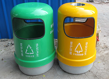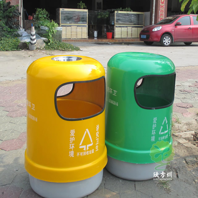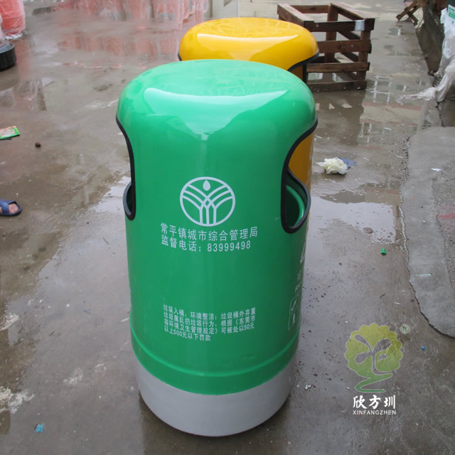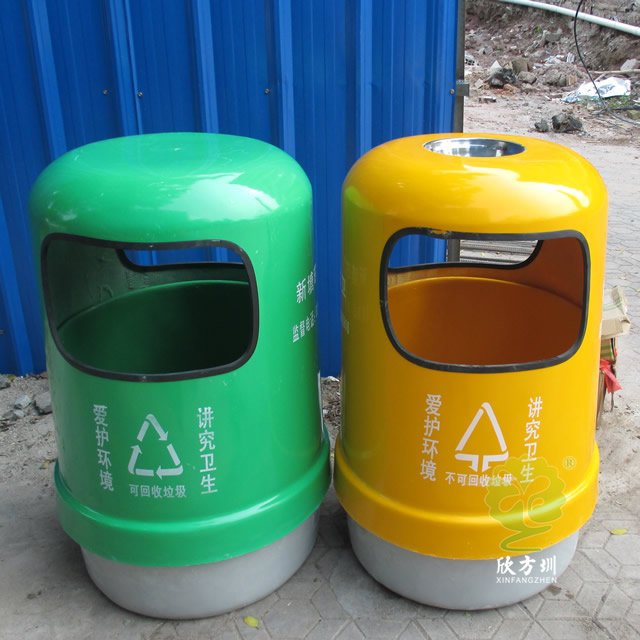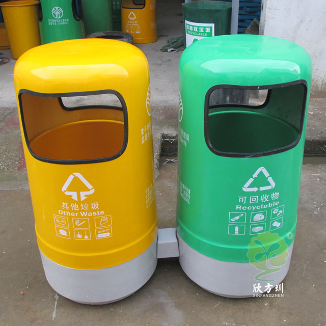 户外环卫玻璃钢分类垃圾桶采用玻璃纤维加树脂复合材料开模制作而成,整体采用圆柱形双桶双面投口设计,不可回收垃圾桶盖和内筒采用了黄色颜料上色、可回收垃圾盖子加内筒采用绿色颜料漆上色,四面丝印标识和企业名称,把桶盖往上提可以方便的取出内筒来,玻璃钢支持定制需要开模欢迎咨询!