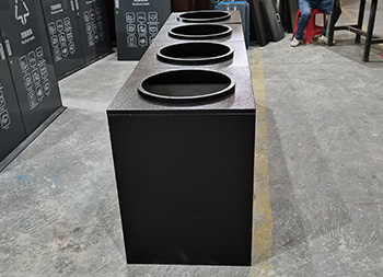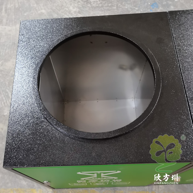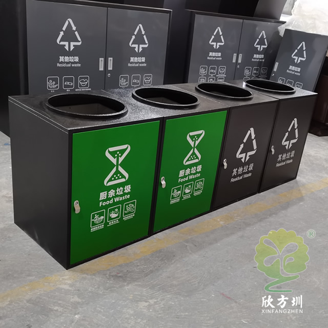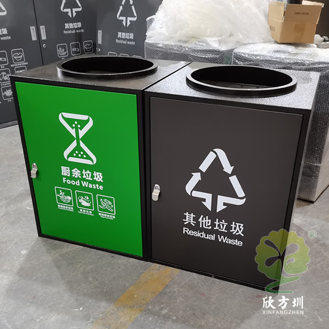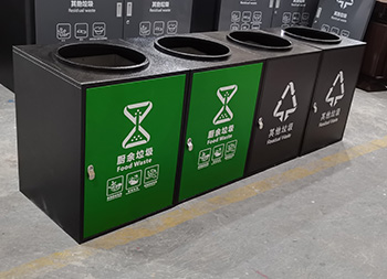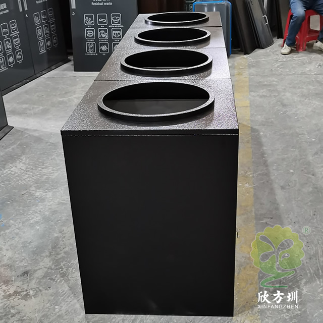 组合式直投口304不锈钢分类垃圾桶采用了304不锈钢板制作,方形组合式圆形直投口设计,垃圾桶整体框架采用了喷塑黑色,门板可以烤漆四色的可方便区分类,门板中心位置丝印了分类标识,组合式分类自由搭配分类,可以摆放在垃圾亭内,正面左边中间位置带一个三角钥匙锁头可以方便打开取出内筒。