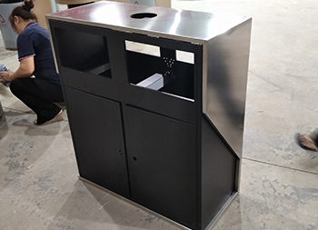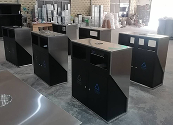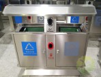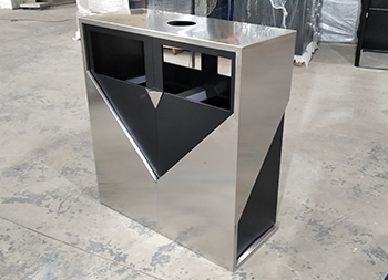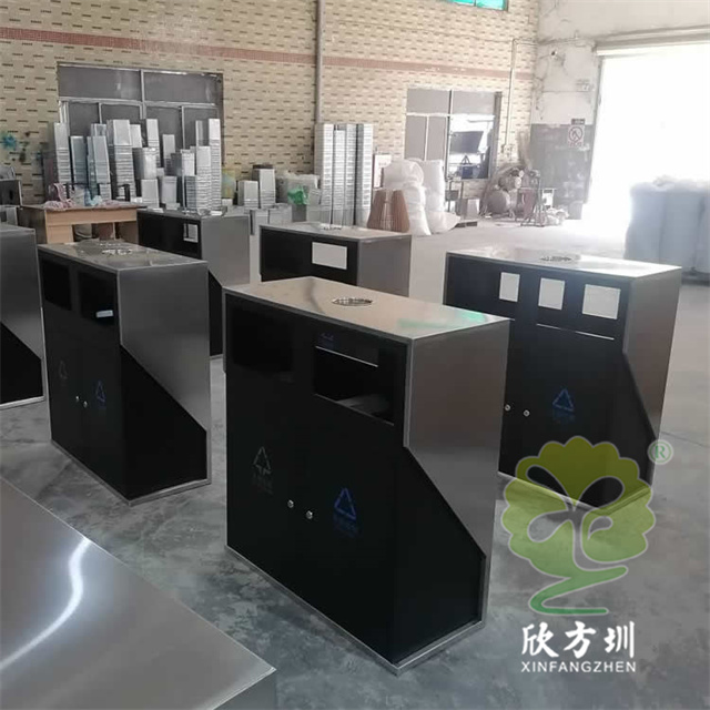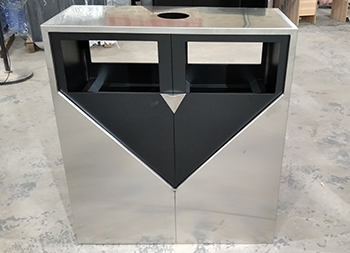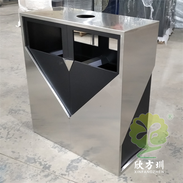 户外街道创意喷粉不锈钢分类垃圾桶采用了304不锈钢板1.0mm制造而成,室外两连体方形设计,创意框架双层双层不锈钢,内侧不锈钢黑色喷粉,顶部带个烟灰盅,背面三角钥匙双开门可以取出内筒,正面丝印单色国标分类标识。