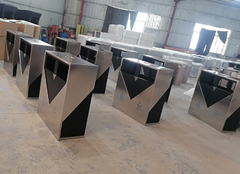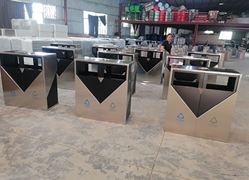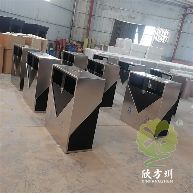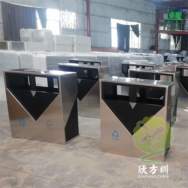 户外街道创意喷粉不锈钢分类垃圾桶制作精良,方形两连体分类设计,适合摆放在户外的物业小区、城市广场、公园景区、市政街道等,注重产品细节部位处理坚固耐用,安全无利口,不伤手,框架201不锈钢外筒,不锈钢内筒。