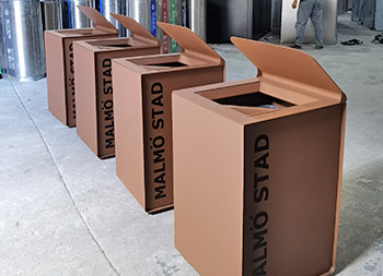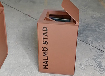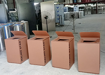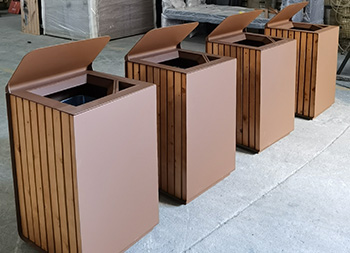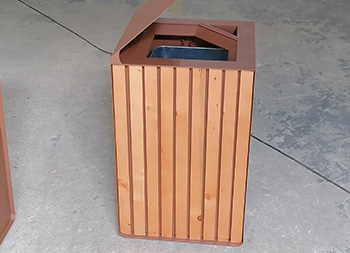 出口户外巧克力色方形不锈钢垃圾桶单筒用201#不锈钢1.0厚度板生产,盖子2.5mm厚度不锈钢板制作,盖子坡面挡雨棚,外框喷塑烤漆巧克力色,正面的细纹不印了,用户要求做纯色即可,左右侧做了凹进去的效果,左侧嵌入木条,右侧金属面黑色油墨英文字母丝印。