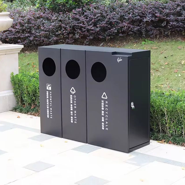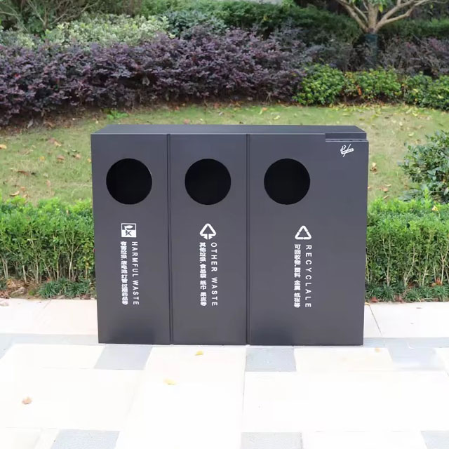 出口公园三分类不锈钢垃圾桶可以采用201不锈钢或者304不锈钢板制造,顶部中心位置凸起出是这款桶创意方形两连体设计,正反面油墨丝网印刷最新国标分类标识和禁烟标识,侧面可以定制丝印企业logo,垃圾桶两个方形投口中间位置带灭烟盒,带三角钥匙开门方便环卫工人清理内置废物。