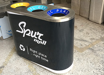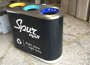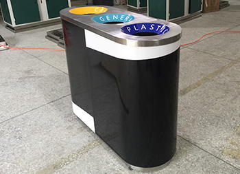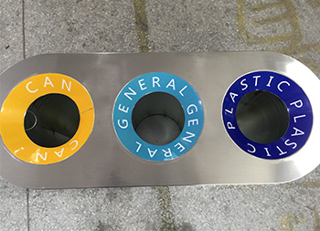 出口室内机场三分类不锈钢垃圾桶采用了优质的201不锈钢板制作而成,这款室内椭圆形立式直投口三分类不锈钢本色设计,外部黑色贴纸包裹,外部黑色贴纸印白色的分类标识和文字,投口斜坡三色贴纸贴了英文的垃圾分类标识,顶部拿开盖子可以取出内筒!