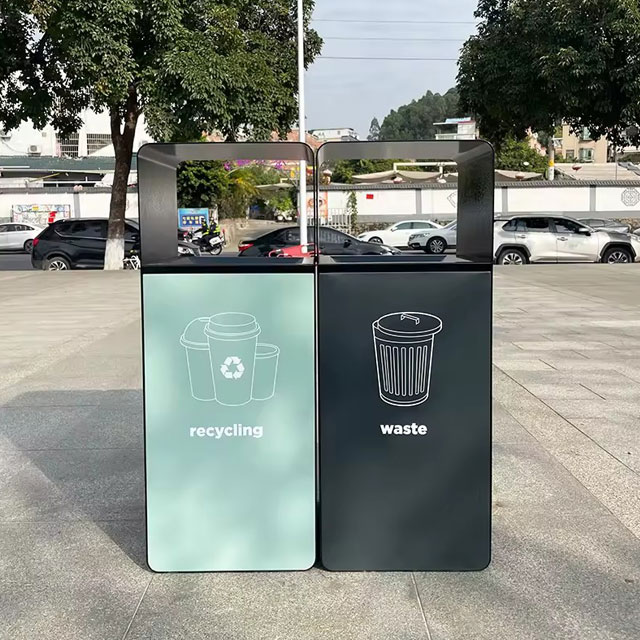 出口贸易组合式两分类不锈钢垃圾桶可以采用201不锈钢或者304不锈钢板制造,顶部中心位置凸起出是这款桶创意方形两连体设计,正反面油墨丝网印刷最新国标分类标识和禁烟标识,侧面可以定制丝印企业logo,垃圾桶两个方形投口中间位置带灭烟盒,带三角钥匙开门方便环卫工人清理内置废物。