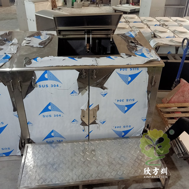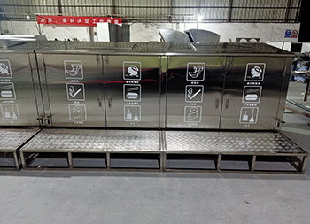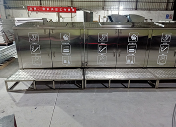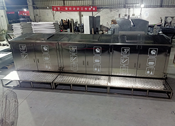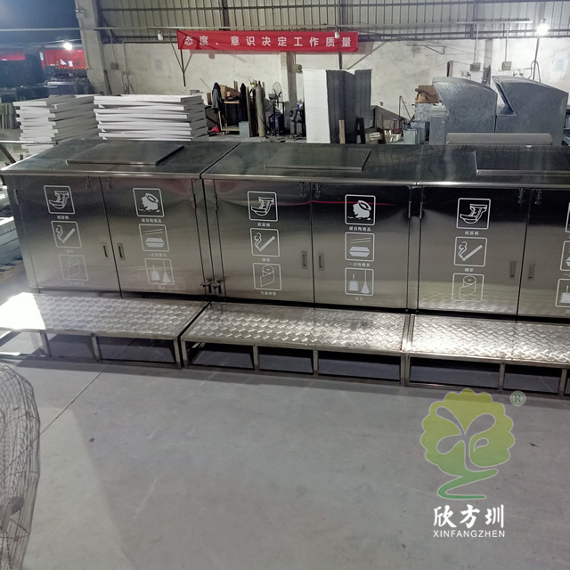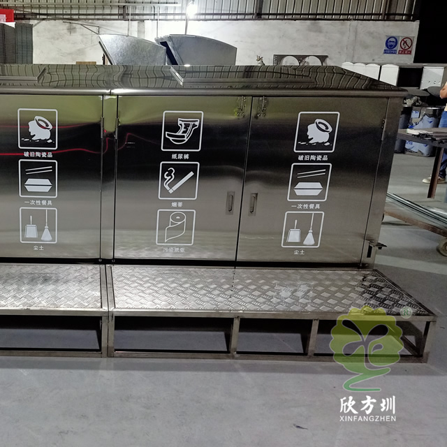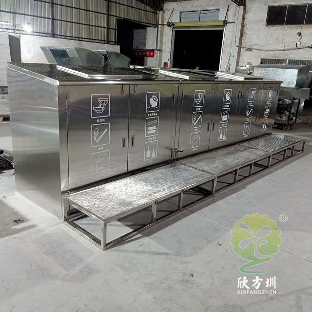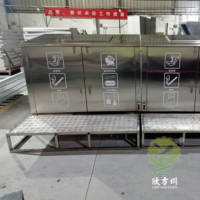 大容量脚踏式不锈钢分类垃圾箱采用了304#不锈钢板制作而成,方形组合脚踏式分类设计,正面门丝印了尿不湿、破旧陶瓷、尘土等图标和文字标识,这款垃圾桶比较高正面脚踏板方便矮的人员投递废物,脚踏板做了防滑处理,内置配备了塑料内筒,2020年最流行的就是这种大容量的垃圾桶。