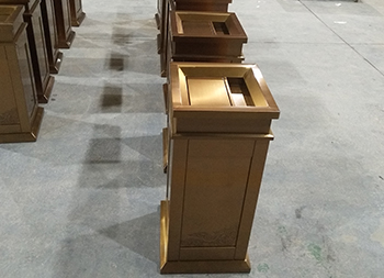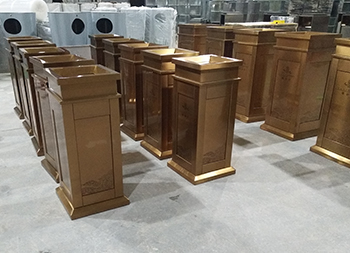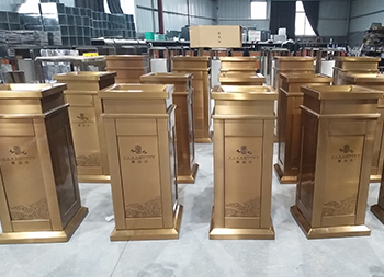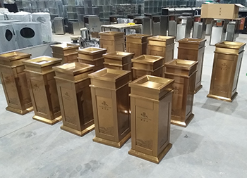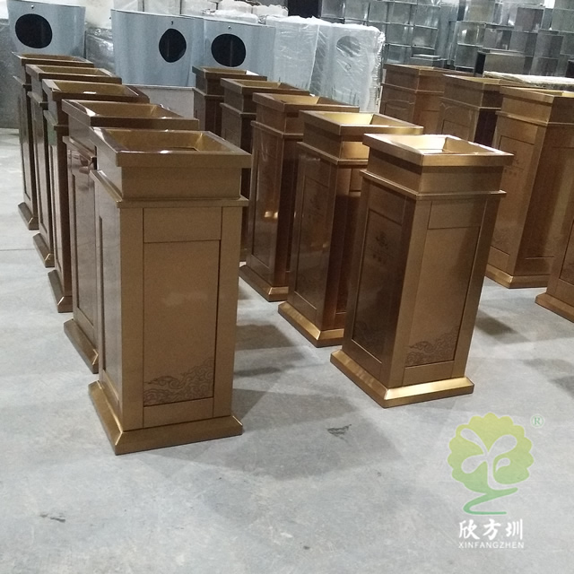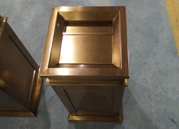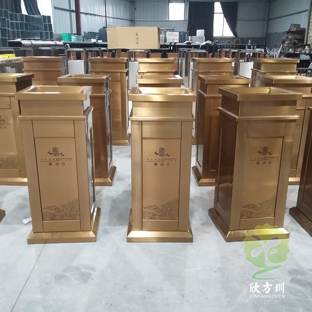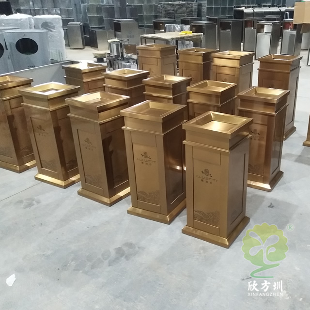 室内电镀方形不锈钢垃圾桶采用了304不锈钢裁剪折弯制造而成,室内方形立式土豪金摇盖式设计,丝网印刷了淡黑色企业logo,前后左右四块板刨坑腐刻了装饰花纹,装饰花纹也可以采用丝印或者UV打印,这款垃圾桶完美外观高档整体奢华。