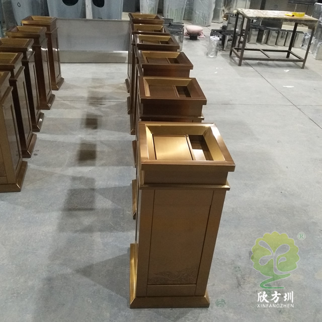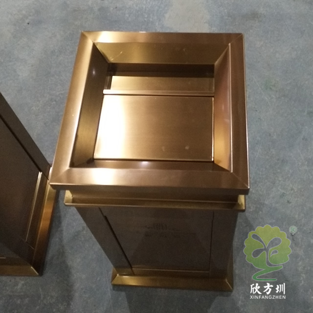 室内电镀方形不锈钢垃圾桶这款垃圾桶制作精良,室内单筒电镀土豪金摇盖式方形设计,适合摆放在物业小区、酒店写字楼、旅游景区等等,注重产品细节部位处理坚固耐用,安全无利口,不伤手,304不锈钢外筒,镀锌板内筒 ,便于垃圾清倒。
