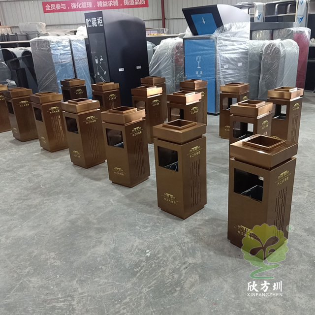 电镀方形物业不锈钢果皮箱使用了201不锈钢板制作而成,采用了方形电镀仿铜色,左右花边采用激光切割制成,前后顶部方形开废物双投口,四周丝网印刷了物业楼盘中英文名称和logo,顶部垃圾桶方形盖可以拿开取出里面的内筒,桶盖中心位置带一个方形的烟灰盅可添加石英砂方便收集烟头。