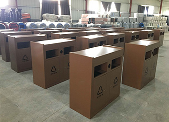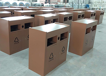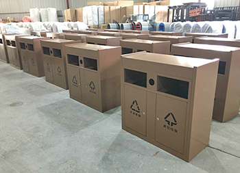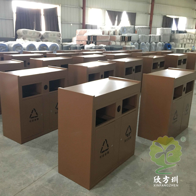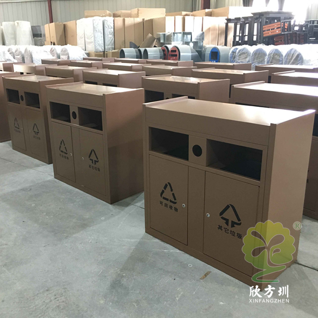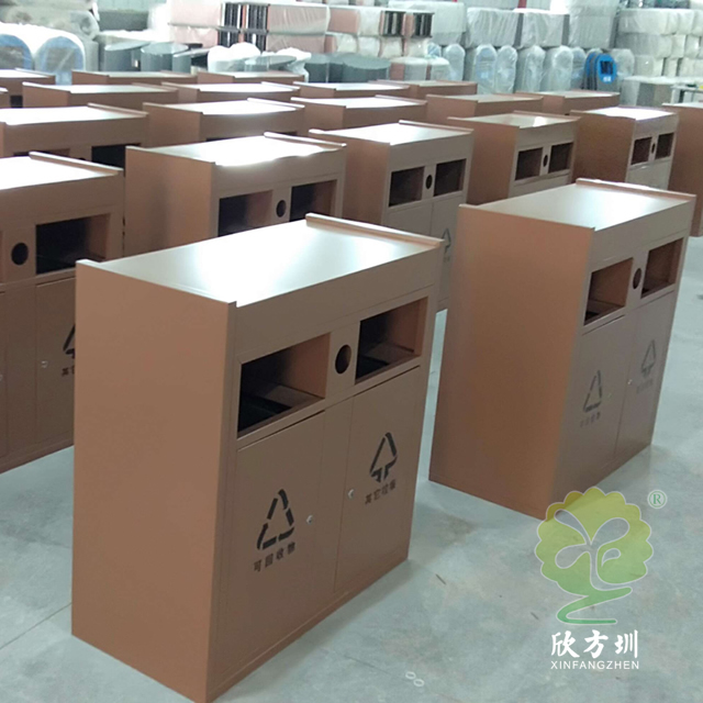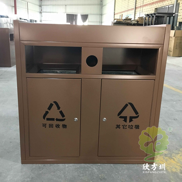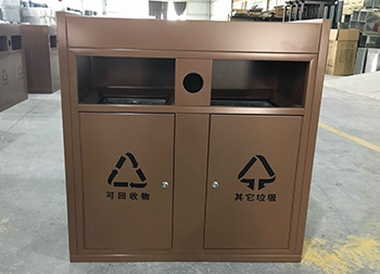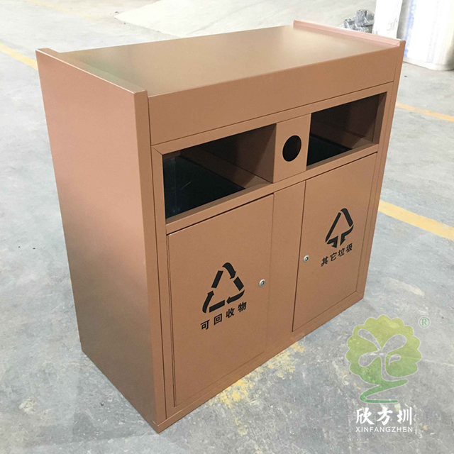 户外电镀不锈钢分类垃圾桶采用了304不锈钢板制作而成,室外两分类方形单面方形投口设计,表面处理采用了米黄色高温汽车烤漆,正面丝网印刷了可回收物和其他垃圾桶,正面三角钥匙开门可以取出桶内的内筒,投口中心位置是一个烟灰烟头投口,这款垃圾桶设计简洁,可以定制三分类、四分类五分类等。
