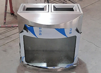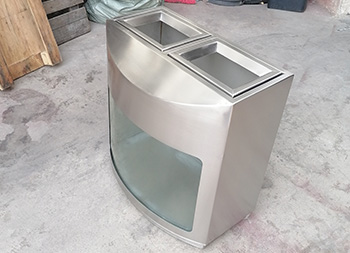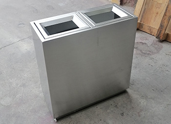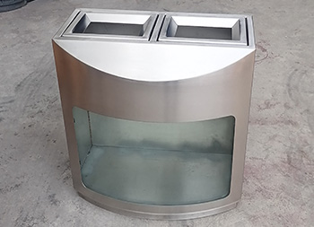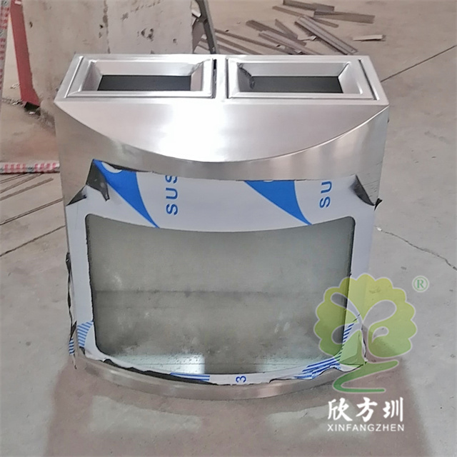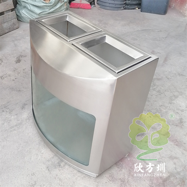 室内地铁站防爆两连体不锈钢分类垃圾桶采用了304不锈钢板2.0mm厚足(1.8mm厚),加6mm+6夹胶透明钢化玻璃,整体不锈钢本色,表面可以使用分类图标及地铁标识,直投口两分类设计,可以挂两个透明垃圾袋,可以定制单筒或三分类四分类,一般地铁站垃圾桶穿上都会穿“透明装”,就是采用亚克力板、钢化玻璃或者镂空,倡议广大市民乘客积极参与垃圾分类行动,养成垃圾分类良好习惯,共同创造和谐美好的出行环境和绿色生态的城市空间。