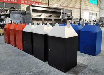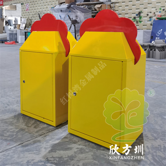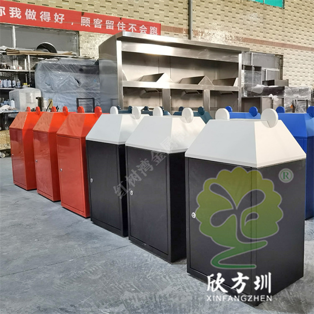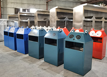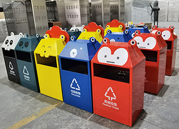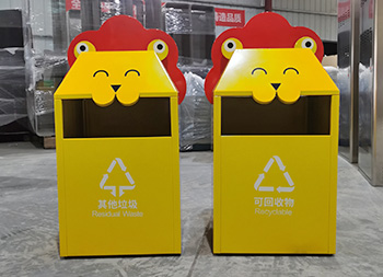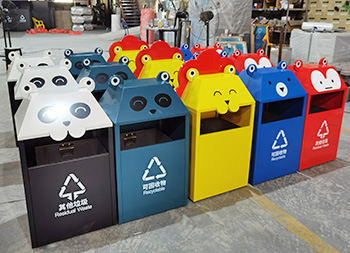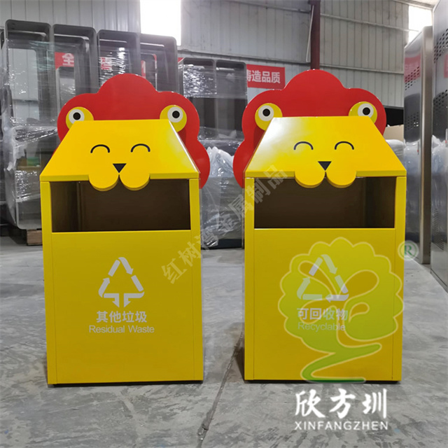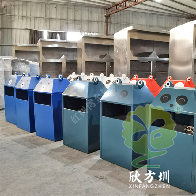 户外卡通动物五色不锈钢分类垃圾桶采用了1.00mm厚的304不锈钢板制造而成,户外方形彩色动物造型设计,每个垃圾桶拥有不同的动物造型,有猴子、狮子、熊猫等造型,桶身表面喷涂喷塑了红色、蓝色、黄色、深绿色、黑色,背面带垃圾桶门板可以使用三角钥匙开门取出内筒,正面丝印了最新国标分类标识。