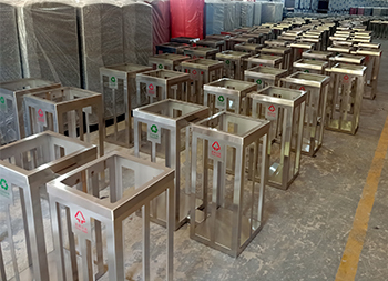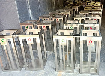 地铁站304不锈钢分类垃圾桶采用了304不锈钢板1.5mm厚的板材制作而成,立式直投口方形哑光双分类设计,四面采用激光切割镂空,前后丝网印刷了可回收物、其他垃圾,很多地铁站都是使用透明防爆垃圾桶,直接套白色塑料袋,可以看清楚桶就废物,防止桶内有危险物品。