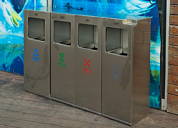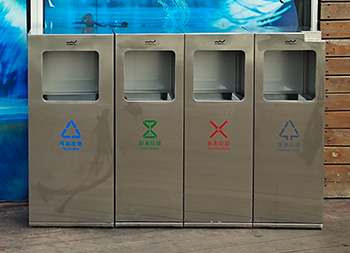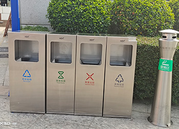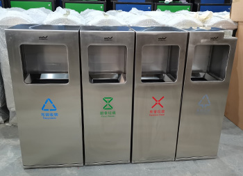 户外广场组合式不锈钢分类垃圾桶采用了201不锈钢板制作而成,四分类方形组合式设计,果皮箱表面哑光,丝网印刷了可回收物、厨余垃圾、有害垃圾、和其他垃圾,投口上方丝印了企业logo,可回收物的尺寸比其他桶的尺寸需要大一些,其他垃圾桶右上角制作了烟灰柱,方便收集烟头烟灰。