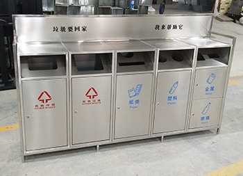 户外大型环保不锈钢分类垃圾箱桶身采用了201不锈钢材质制造而成,这款垃圾回收箱可以回收五种类不同的垃圾,分别有两个其他垃圾桶,一个纸类和一个塑料,金属跟玻璃共用一个桶,单独这个共用的垃圾桶和其他的不同分别有两个门和两个内筒,每个桶的投口大小不一,这款垃圾桶我们简称玻金塑纸。