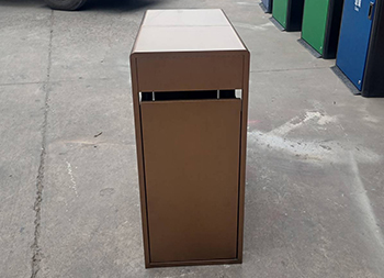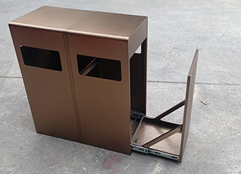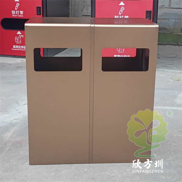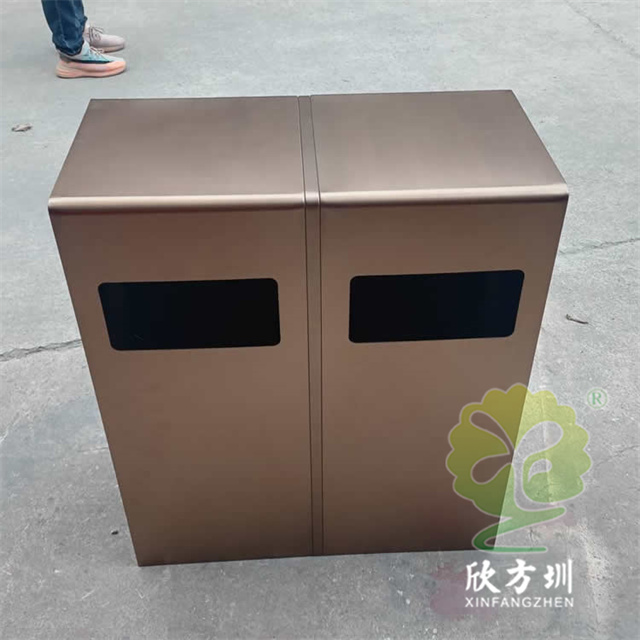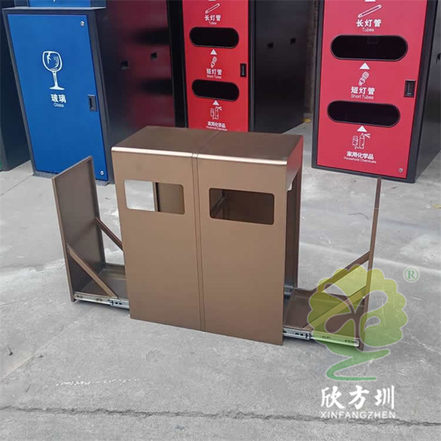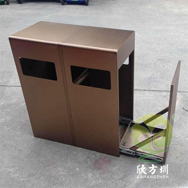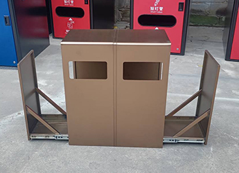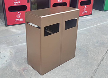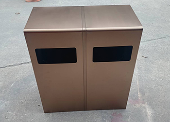 户外电镀滑轨抽拉式不锈钢分类垃圾桶采用了304不锈钢1.5mm厚的板制作而成,侧面两连体分类抽拉式滑轨设计,果皮箱金属表面电镀香槟金和做防指纹处理工艺,正反面可以油墨丝网印刷国标分类标识和企业logo,可以定制本色或者喷塑桶身。