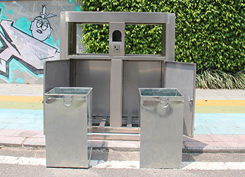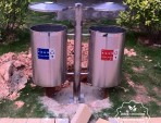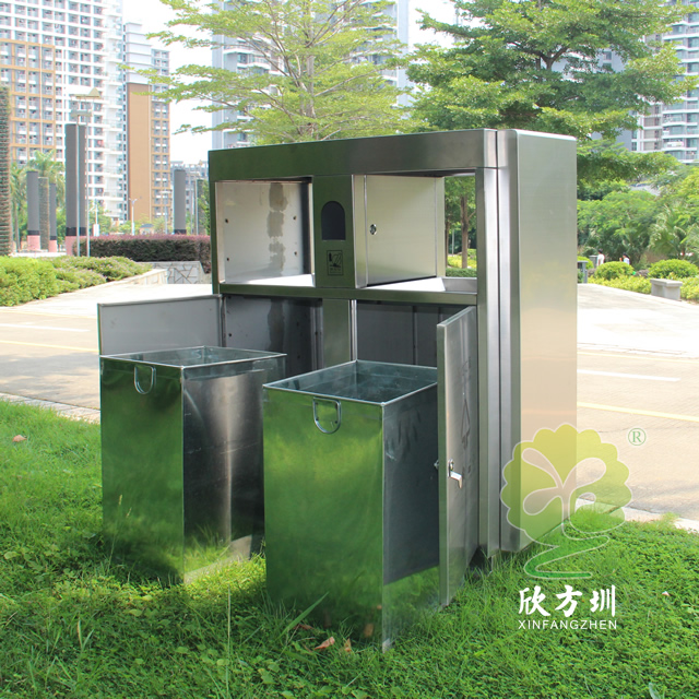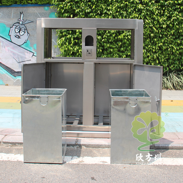 户外公园双分类不锈钢垃圾箱制作精良,两分类方形高档设计,注重产品细节部位处理坚固耐用,安全无利口,不伤手,201#不锈钢外筒,镀锌板内筒 ,便于垃圾清倒。