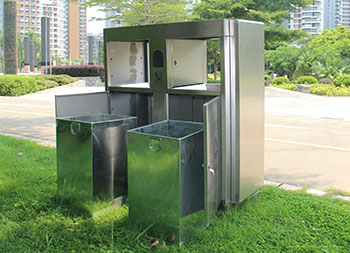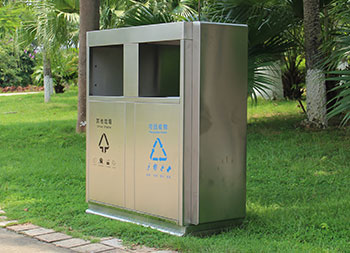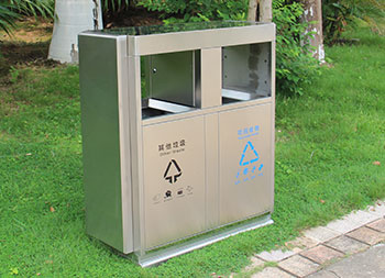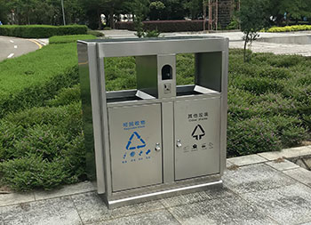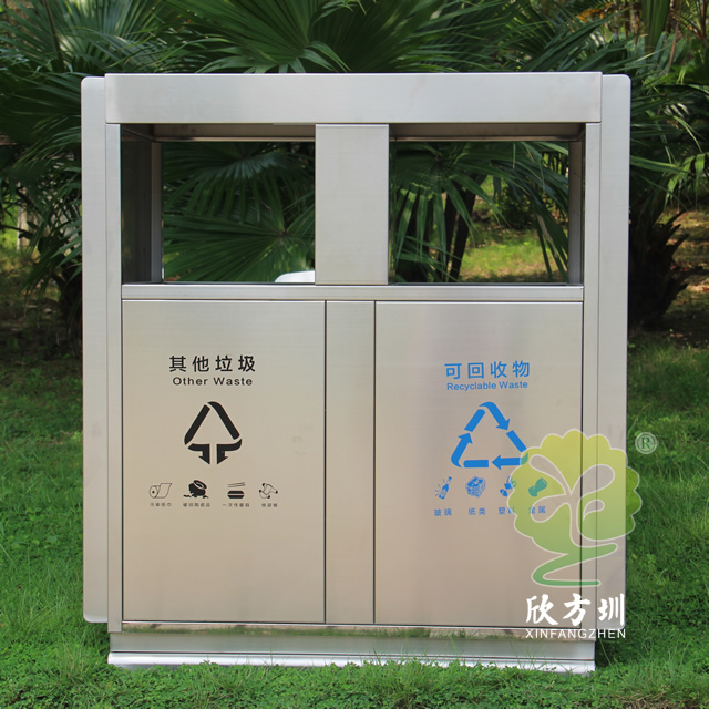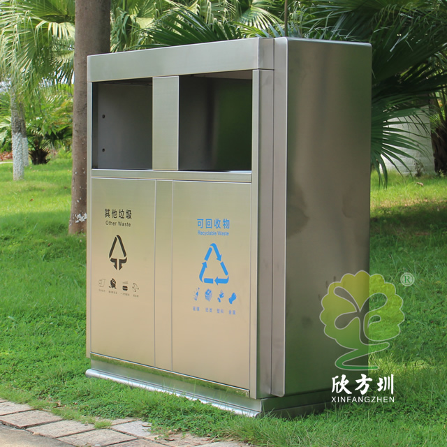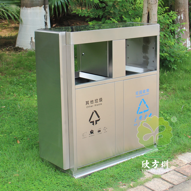户外公园双分类不锈钢垃圾箱采用201#不锈钢板制作而成,这款垃圾桶设计简洁大气哑光其他垃圾、可回收垃圾两分类设计,两边侧面中心可以开烟灰盅或者有害垃圾投口,表面处理电镀、烤漆多选择还可以定制丝印企业logo名称。