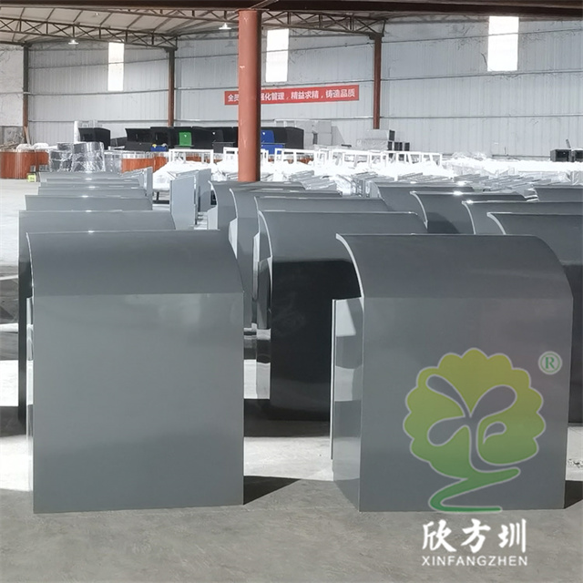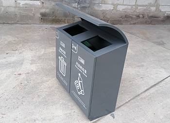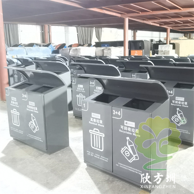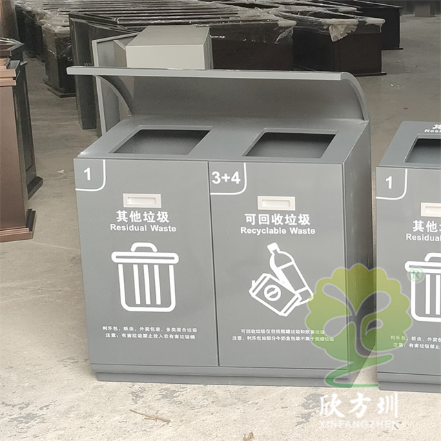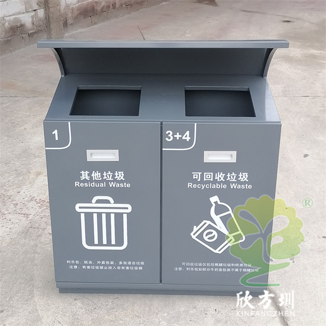 户外滑轨两连体不锈钢分类垃圾桶可以采用201/304不锈钢板、镀锌板、热轧钢板制作,方形两连体滑轨设计,投口上方带弧形挡雨棚,桶身表面灰色喷涂喷塑,丝印了白色的其他垃圾和可回收垃圾分类标识,正面带抽拉式把手,欣方圳厂家支持定制。