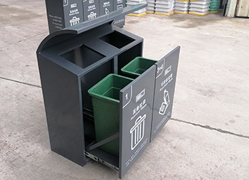户外滑轨两连体不锈钢分类垃圾桶制作精良,户外方形两连体滑轨抽拉式设计,注重产品细节部位处理坚固耐用,安全无利口,不伤手,304#或201不锈钢外筒,内筒采用玻璃钢内筒,另外选择镀锌板、不锈钢板、或者塑料内筒等等,便于垃圾清倒;适合摆放场景:户外物业小区、公园景区、城市广场等等。