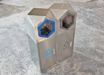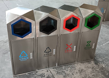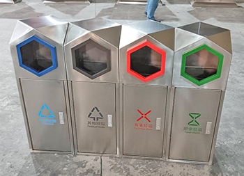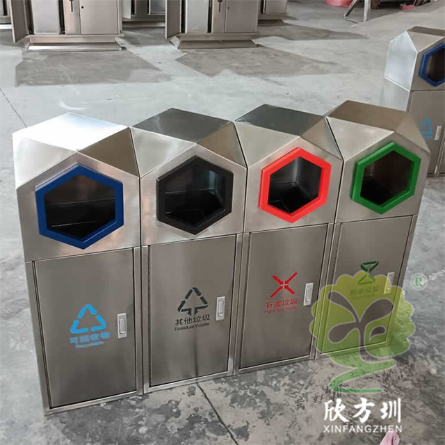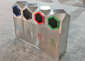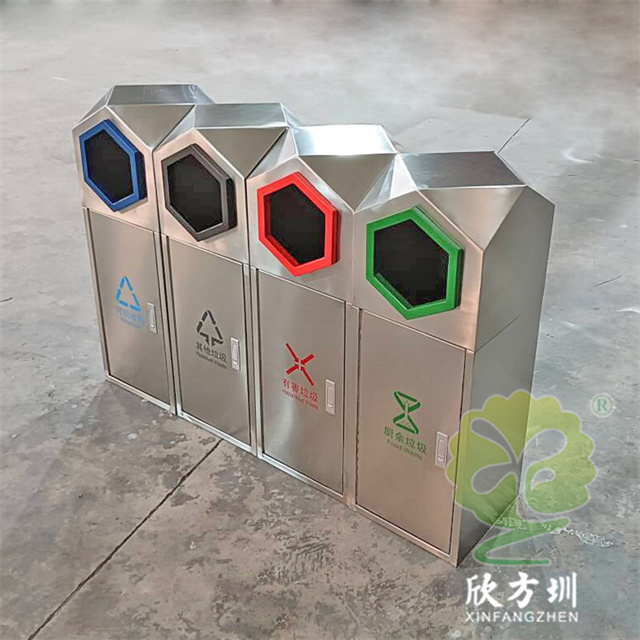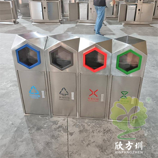户外菱形组合式不锈钢分类垃圾桶可以采用201或者304不锈钢板制作,单筒组合式顶部菱形设计,六边形投口不锈钢烤漆四色喷塑,无烟灰盅门板磁吸方便取出内筒,此款果皮箱可以定制镀锌板烤漆,门板可丝网印刷中英文国标分类标识,支持做腐刻、电镀、拉丝、防指纹处理等工艺。