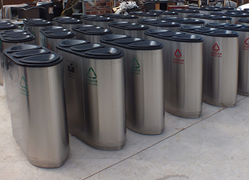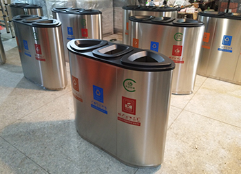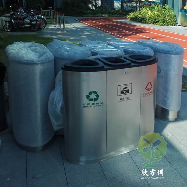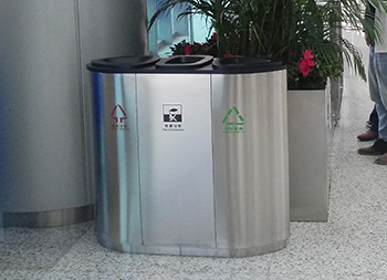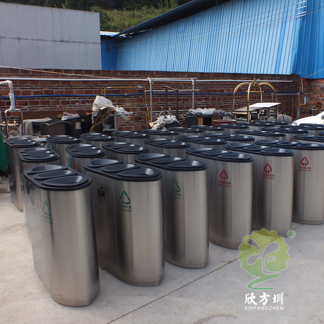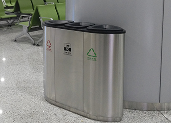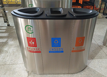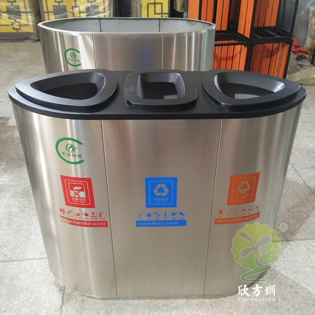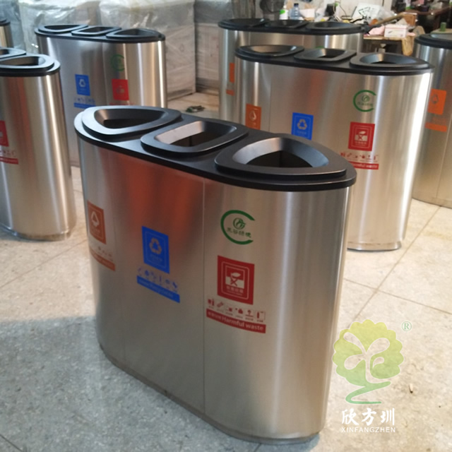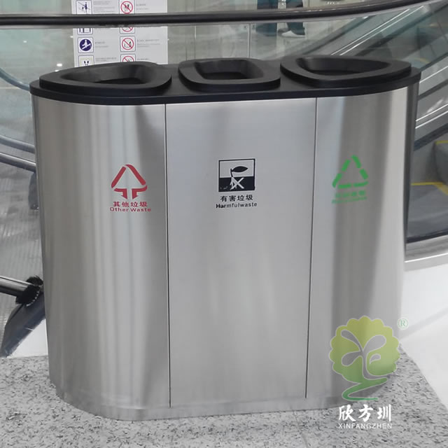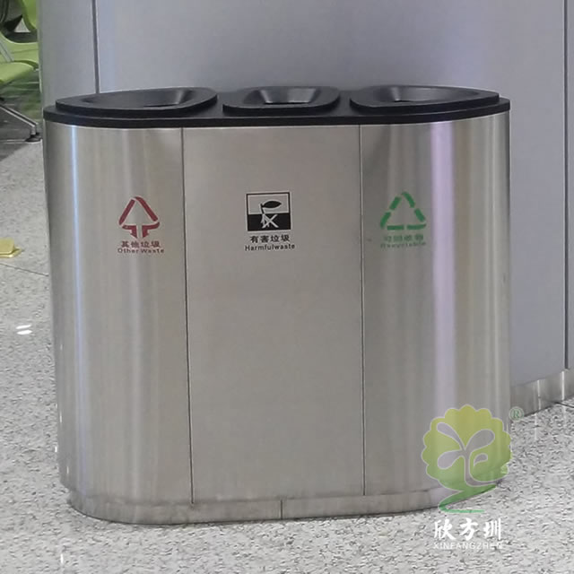 机场商场室内三分类不锈钢垃圾桶这款废物分类垃圾桶使用了304不锈钢板材制作,边缘椭圆形三分类立式直投口设计,分类标识及企业logo可以定制丝印上去,三分类包涵其他垃圾、有害垃圾、可回收垃圾三个垃圾桶,盖子采用了黑色的汽车烤漆,立式的垃圾桶方便投递垃圾容易清理桶内废物。
