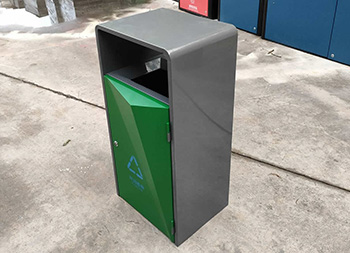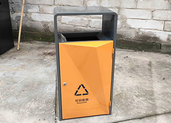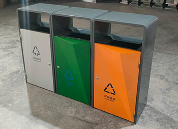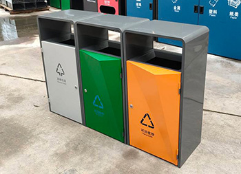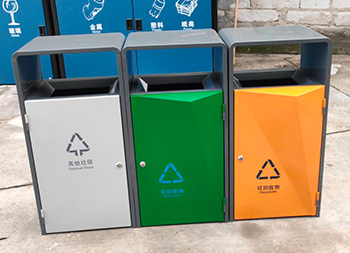 户外学校菱形组合式不锈钢分类垃圾桶可以选用不锈钢板、冷轧钢板、镀锌铁板制作,方形单桶组合式设计,框架表面喷塑烤漆灰色,橘黄色和绿色门板菱形设计,浅灰色平面门板,门板可以丝印分类标识及企业logo,可以使用三角钥匙开门取出内筒。