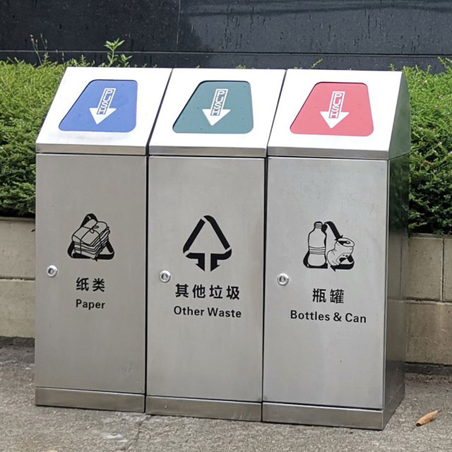 密闭式三分类带盖不锈钢垃圾桶制作精良,不锈钢本色户外连体两分类方形垃圾桶设计,适合摆放在室内物业小区、市政街道、广场、工业区道路或公园景区等等,注重产品细节部位处理坚固耐用,安全无利口,不伤手,框架201不锈钢外筒,不锈钢内筒也可以选择镀锌板、塑料、玻璃钢等等,便于垃圾清倒。