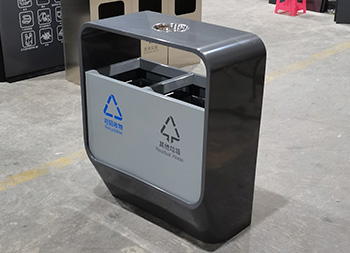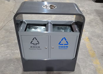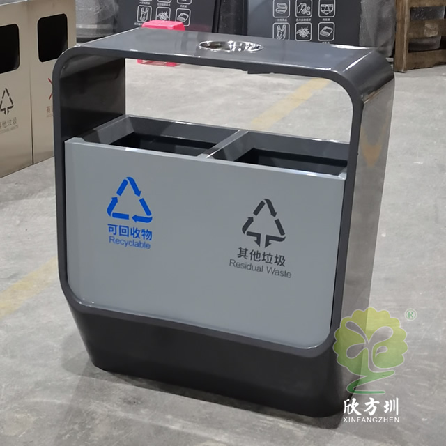 户外喷塑不锈钢分类垃圾桶采用了201#型号1.0厚的不锈钢板制作而成,方形两分类设计,两种颜色喷塑灰色、灰白搭配,底部创意设计小斜口坡面,顶部中心位置带一个圆形烟灰盅,正面丝印了可回收物和其他垃圾,正面三角钥匙开门可取出设备里面的内筒。