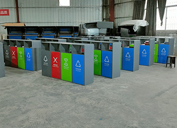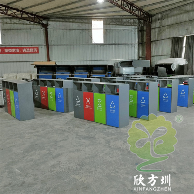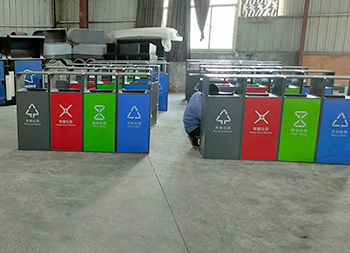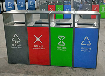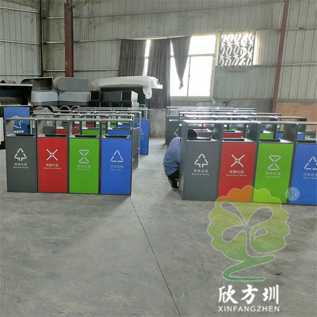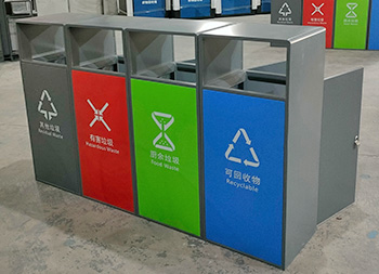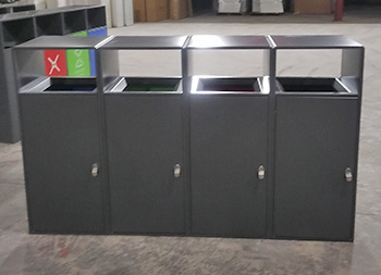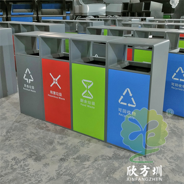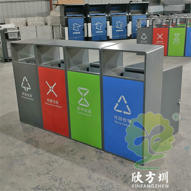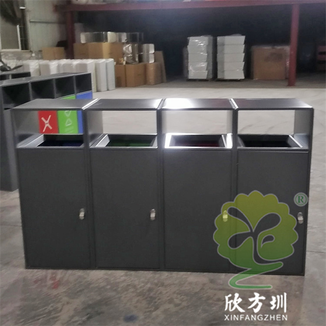 户外喷塑四色不锈钢分类果皮箱垃圾桶这款垃圾桶制作精良,喷塑方形四分类垃圾桶设计,适合摆放在室内物业小区、市政街道、城市广场、公园景区等等,注重产品细节部位处理坚固耐用,安全无利口,不伤手,框架201不锈钢外筒,镀锌板内筒也可以选择塑料、不锈钢、玻璃钢等等,便于垃圾清倒。