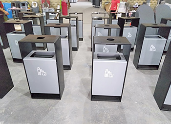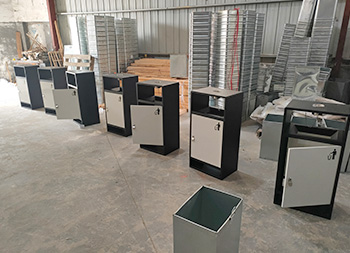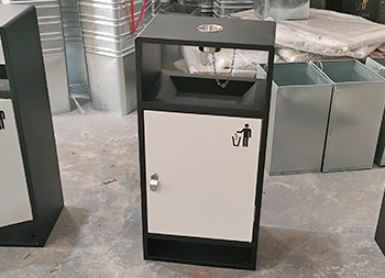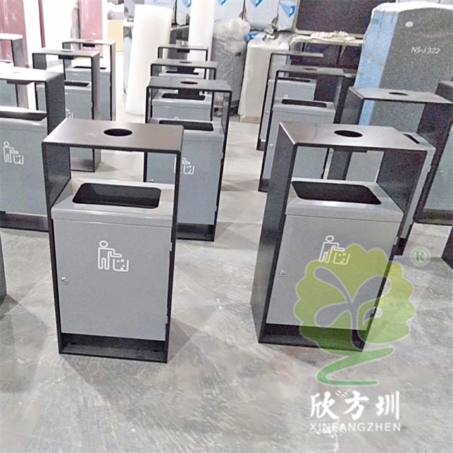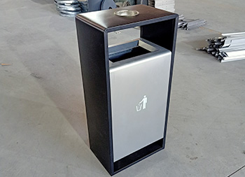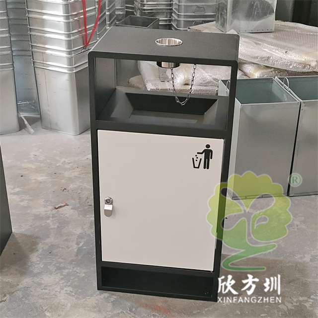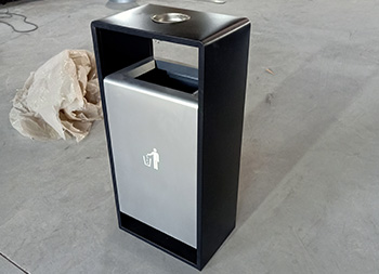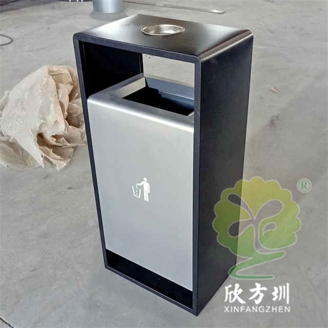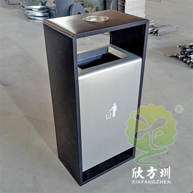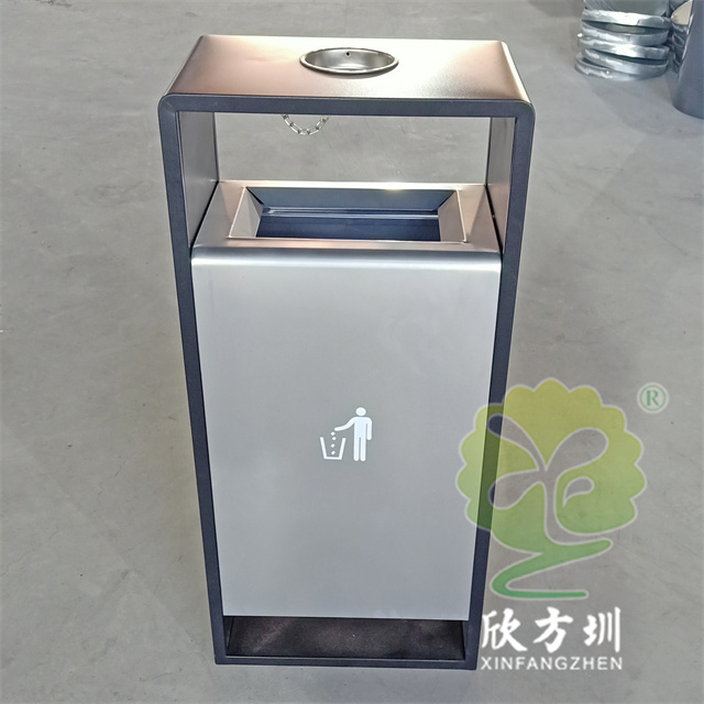 户外热销方形简易不锈钢垃圾桶可以选用不锈钢或者镀锌板制作,这款果皮箱框架喷涂黑色塑粉桶身喷塑银色,表面可以根据用户要求定制,顶部中心位置带圆形的烟灰盅,投口带折边,桶身离地面比较高也有效避免雨水进入,可以丝印logo人头标或分类标识。