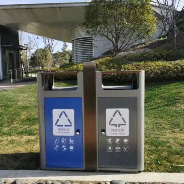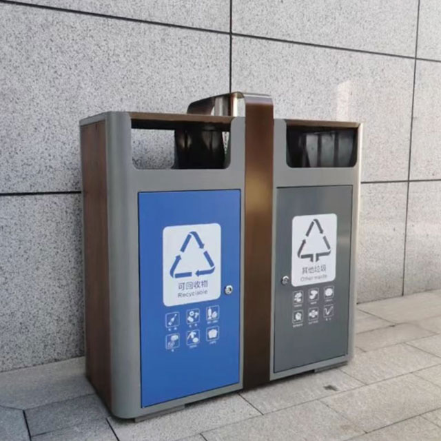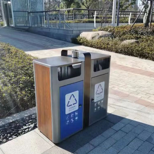 热销两连体喷粉不锈钢分类垃圾桶制作精良,不锈钢本色户外连体两分类方形垃圾桶设计,适合摆放在室内物业小区、市政街道、广场、工业区道路或公园景区等等,注重产品细节部位处理坚固耐用,安全无利口,不伤手,框架201不锈钢外筒,不锈钢内筒也可以选择镀锌板、塑料、玻璃钢等等,便于垃圾清倒。