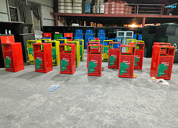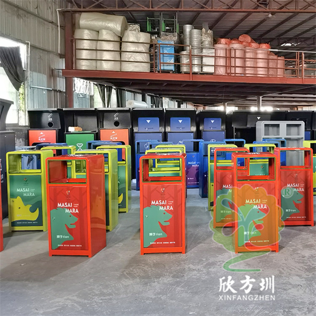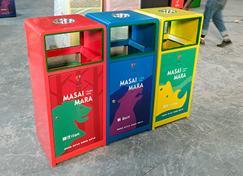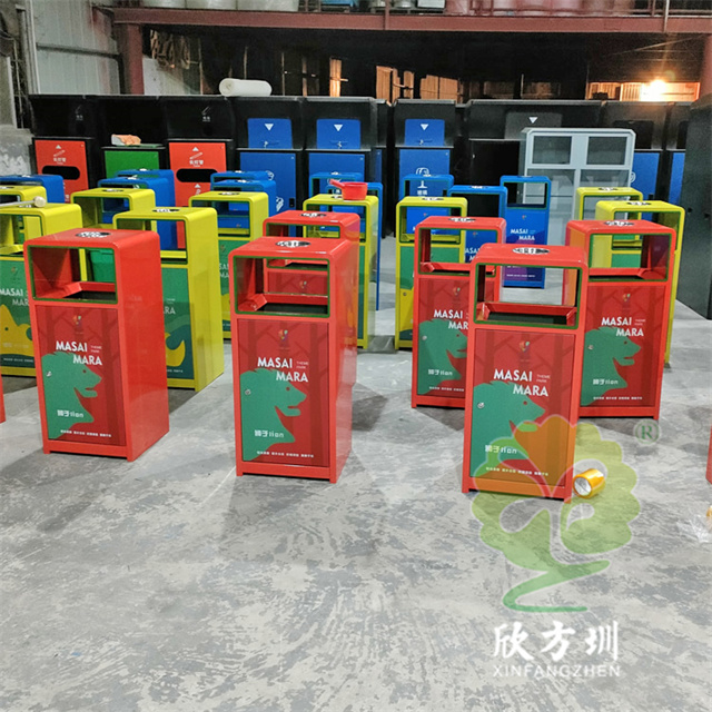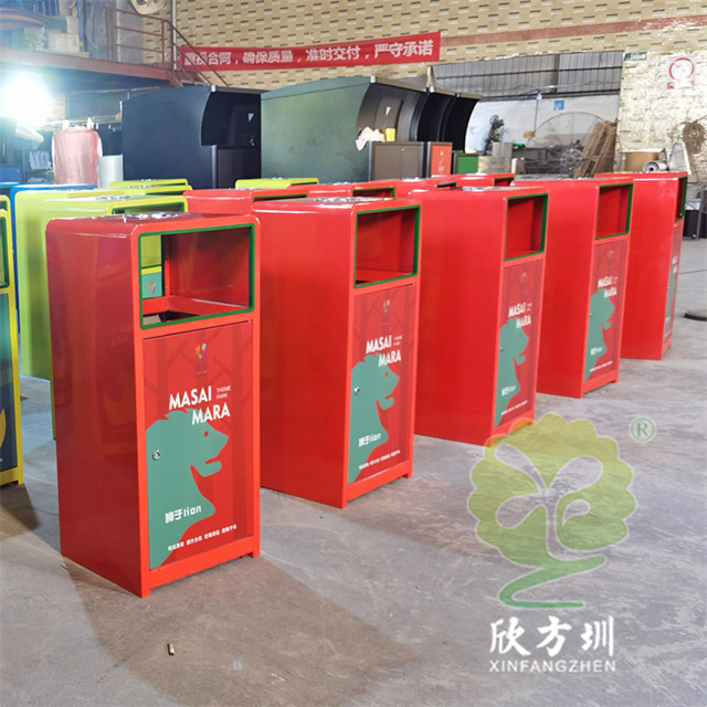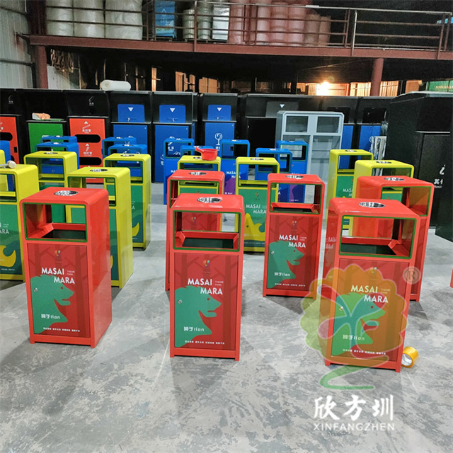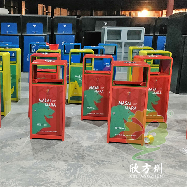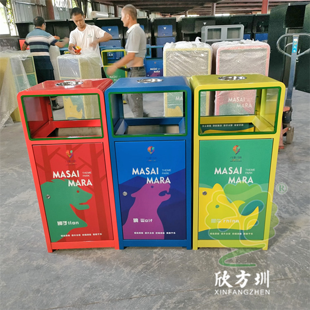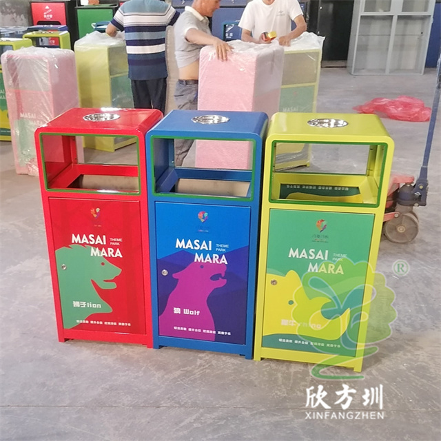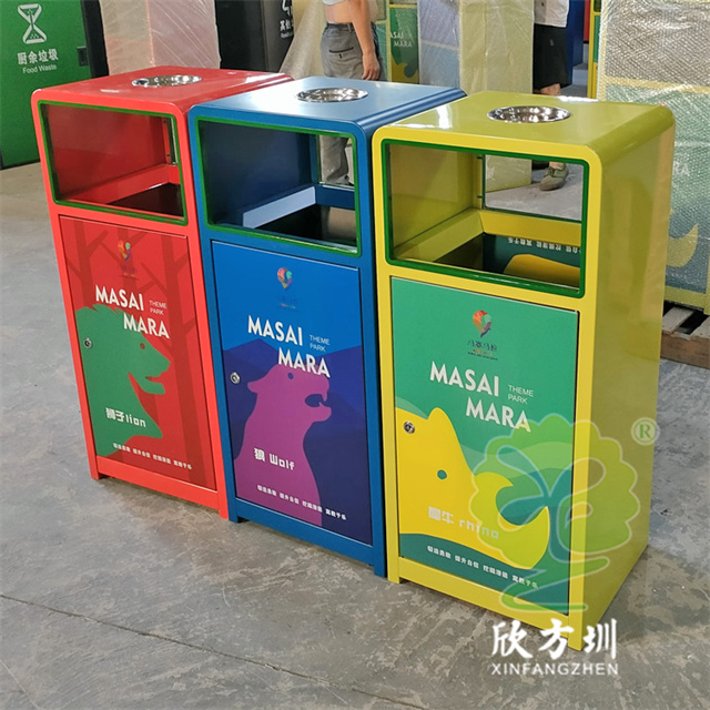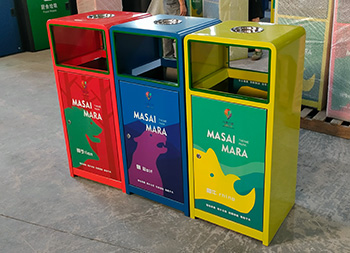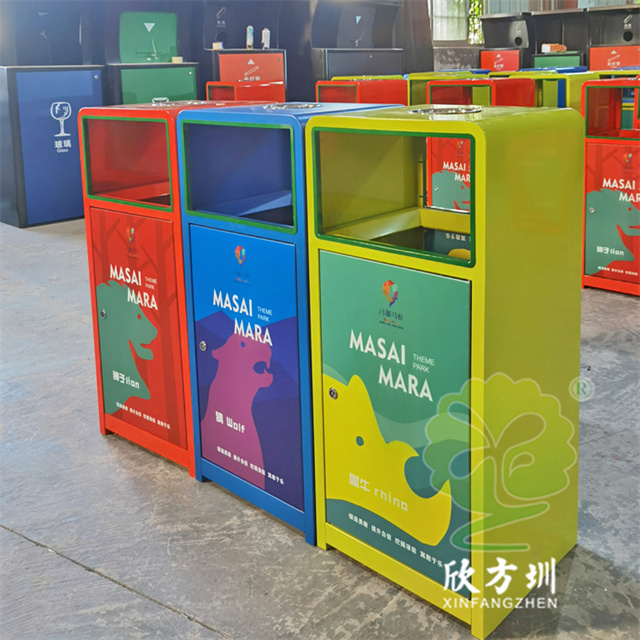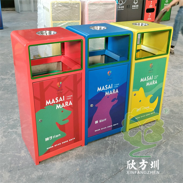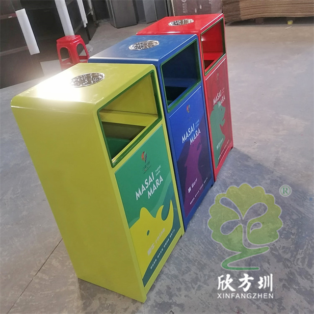 户外三色加厚不锈钢分类垃圾桶采用了2.00mm厚304#不锈钢板制造而成,一般常规的不锈钢板厚度我们厂家都会使用1.00mm厚,室外组合式方形双面投口设计,表面采用了三色喷涂喷塑上色,垃圾桶门板应用了UV打印抽象卡通图案,顶部中心位置带碗形烟灰盅,门板左中间带三角钥匙锁头,我们厂家支持板材、厚度、表面工艺定制。
