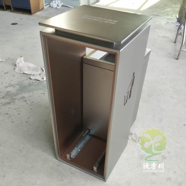 商场电梯口方形不锈钢垃圾桶制作精良,单筒方形抽屉式设计,注重产品细节部位处理坚固耐用,安全无利口,不伤手,304#不锈钢外筒,方形镀锌板内筒,或者选择:不锈钢、塑料、玻璃钢等内筒制作,便于垃圾清倒;适合摆放场景:室内物业小区电梯口、购物商城电梯口、娱乐场所电梯口等等。
