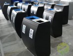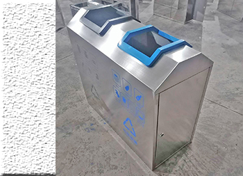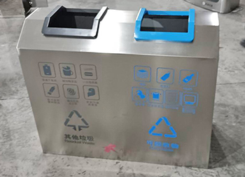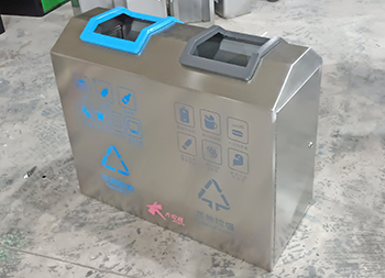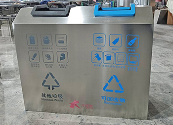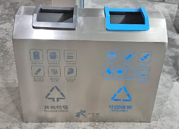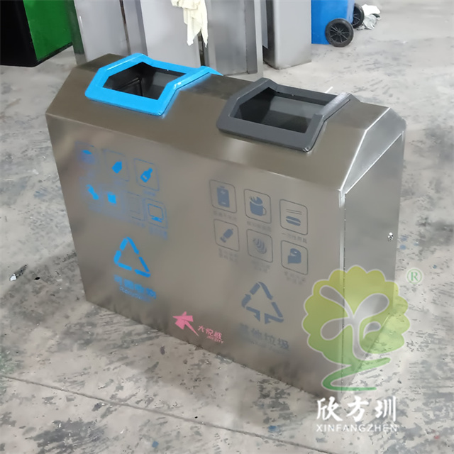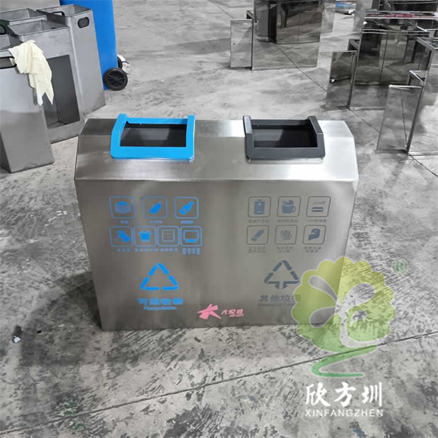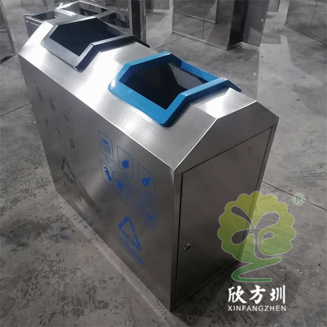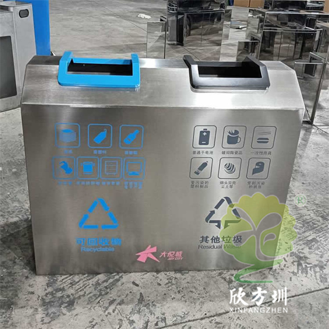 室内商用直投口不锈钢分类垃圾桶采用201不锈钢1.0mm厚的板制作,采用两连体直投口方形设计,投口可回收物喷塑蓝色其他垃圾投口喷塑黑色,正反面丝网印刷国标分类标识及企业logo,侧面可以使用三角钥匙开门取出内胆方便环卫工人清理废物,欣方圳是一家专业定制户外室内公共区域环卫垃圾桶的厂家。