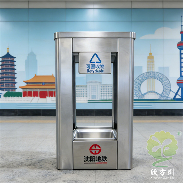 沈阳室内地铁站防爆分类不锈钢垃圾桶可以采用201不锈钢或者304不锈钢板制造,顶部中心位置凸起出是这款桶创意方形两连体设计,正反面油墨丝网印刷最新国标分类标识和禁烟标识,侧面可以定制丝印企业logo,垃圾桶两个方形投口中间位置带灭烟盒,带三角钥匙开门方便环卫工人清理内置废物。