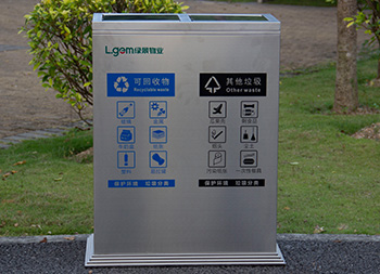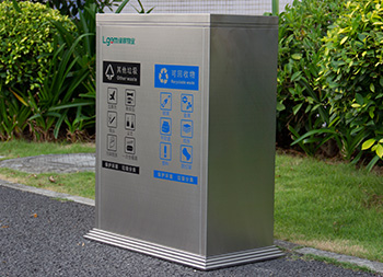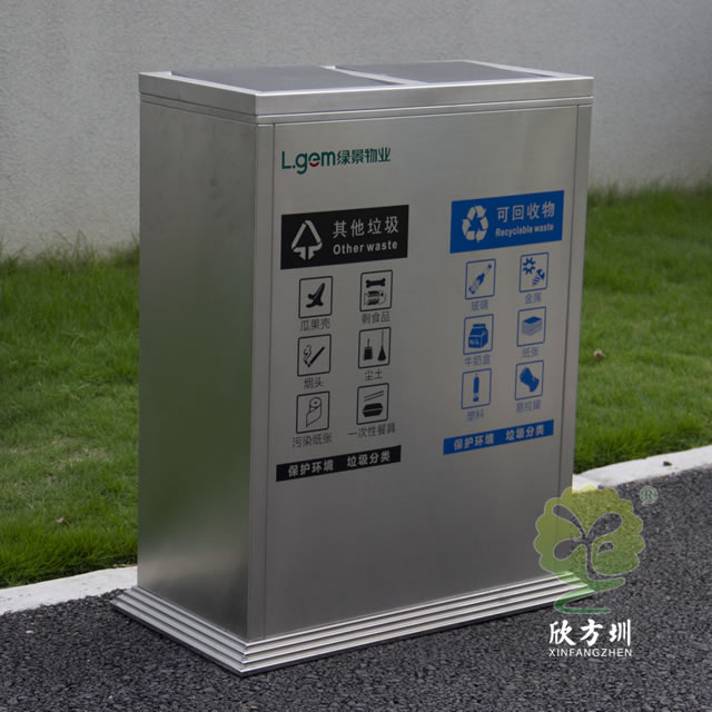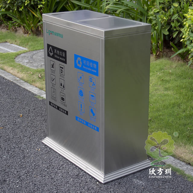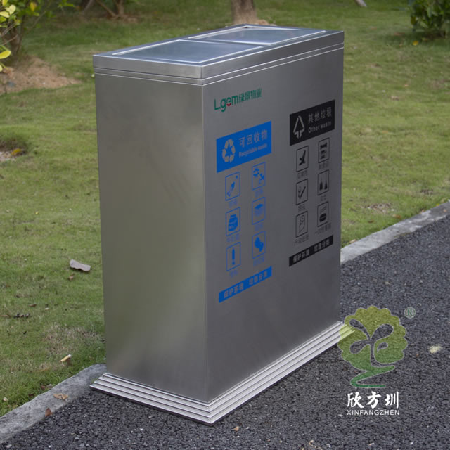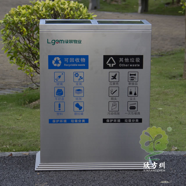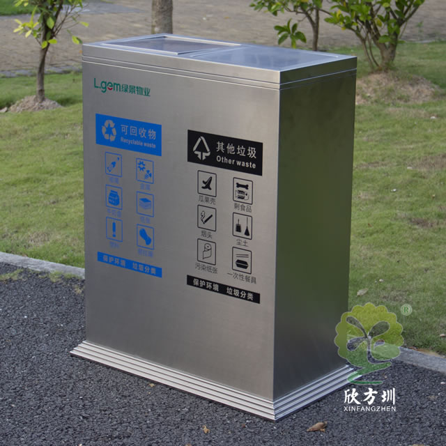 室内摇盖式双分类不锈钢垃圾桶这款果皮箱采用了201不锈钢板制作,我们工厂支持定制可以选用201、304、316等不锈钢板制作垃圾桶,此款垃圾桶其他垃圾、可回收物双分类摇盖式室内设计,丝印了分类标识及企业logo名称,底盘阶梯设计底部抓地牢固,大气简约制作。