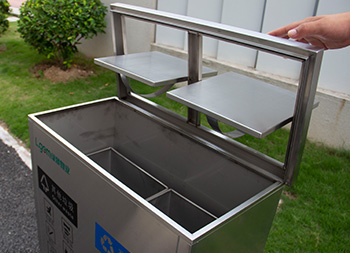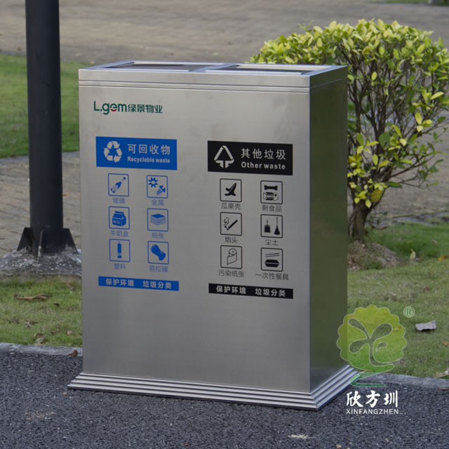 室内摇盖式双分类不锈钢垃圾桶制作精良,双分类方形摇盖式高档设计,适合摆放在物业小区、车站、医院、商场等等,注重产品细节部位处理坚固耐用,安全无利口,不伤手,201不锈钢外筒,镀锌板内筒 ,便于垃圾清倒。