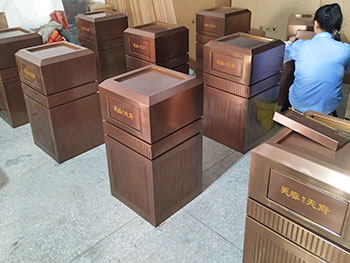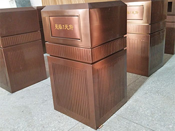 室内高档电镀古铜色不锈钢垃圾桶可选用201#,202#,304#不同型号的不锈钢材质,生产的成品价格也会不同,不同型号材质表面加工不同抗腐蚀能力也是有区别的,腐蚀环境要求光滑的表面是因为表面光滑不容易积垢,污垢的沉积会使不锈钢生锈甚至造成腐蚀。表面还可做防指纹处理,指纹手印虽然可以擦掉,但影响美观,所以可根据客户需求选用防指纹处理。若觉得不锈钢本色比较单调,那么你可选择产品表面电镀工艺,钛金、玫瑰金等颜色高档美观,可定制各种色彩和各种不锈钢垃圾桶款式。