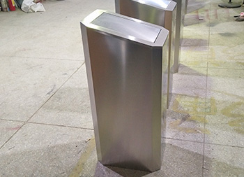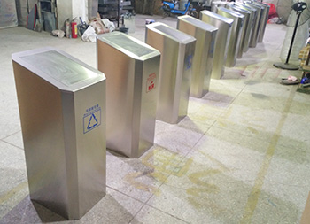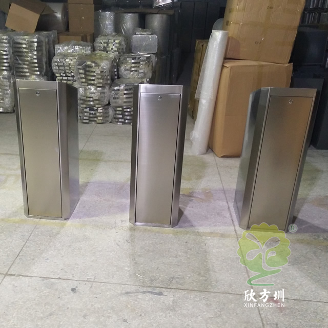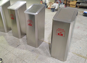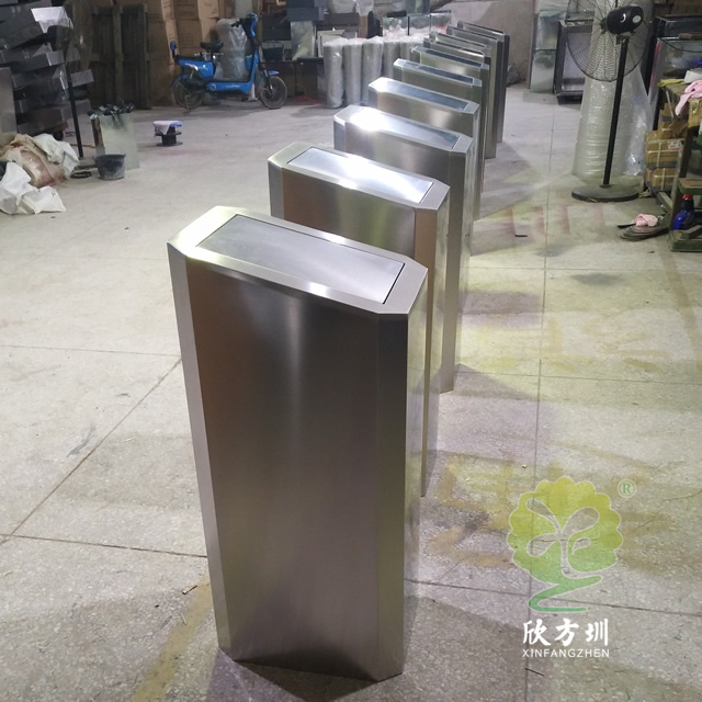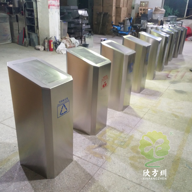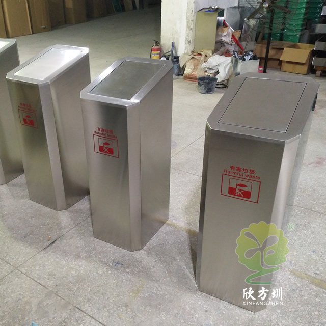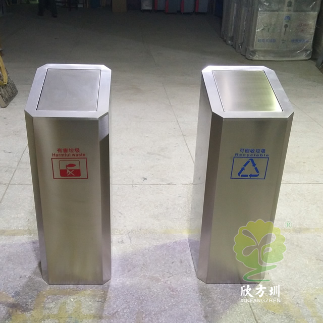 室内摇盖组合式不锈钢分类果皮箱采用201不锈钢板制作而成,方形新款摇盖组合式顶部投口斜坡不锈钢本色设计,正面丝印了垃圾分类标识,反面三角钥匙抽拉式开门取出内筒,我们欣方圳生产厂家支持规格大小,金属还有支持电镀、高温烤漆、防指纹处理等一系列工艺。