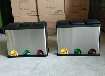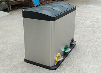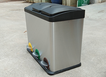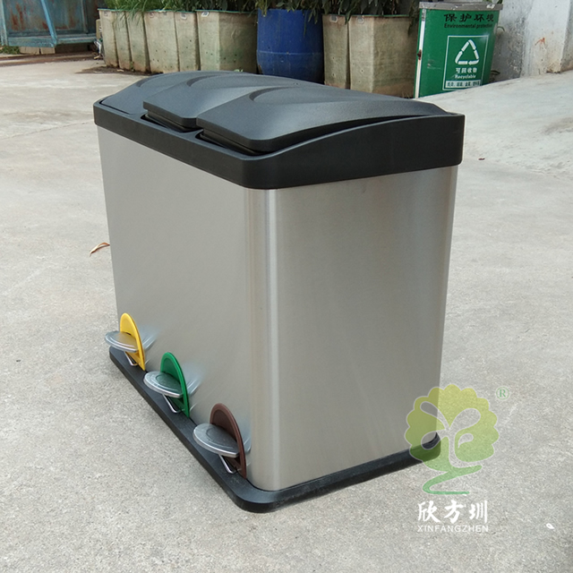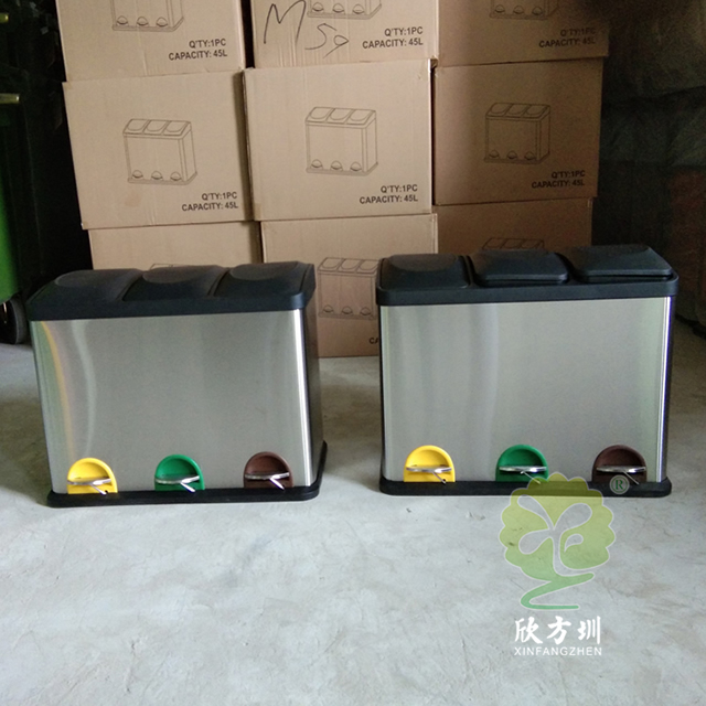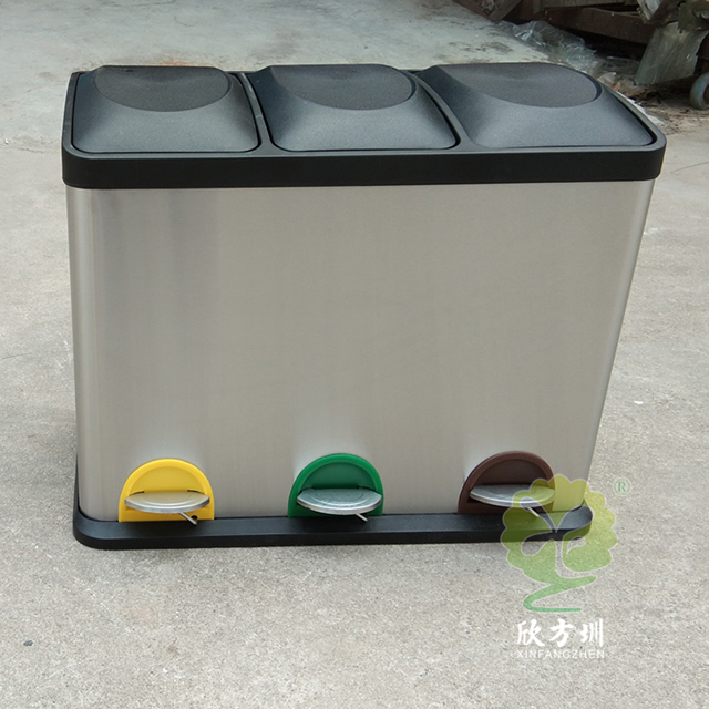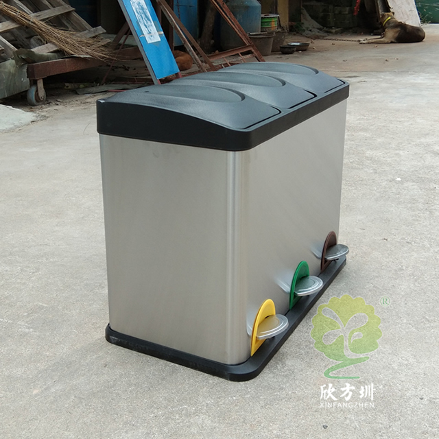 室内静音脚踏式三分类不锈钢垃圾箱制作精良,室内脚踏式三分类设计,适合摆放在室内物业小区、学校、写字楼、医院、商场等等,注重产品细节部位处理坚固耐用,安全无利口,不伤手,201不锈钢外筒,镀锌板内筒 ,便于垃圾清倒。