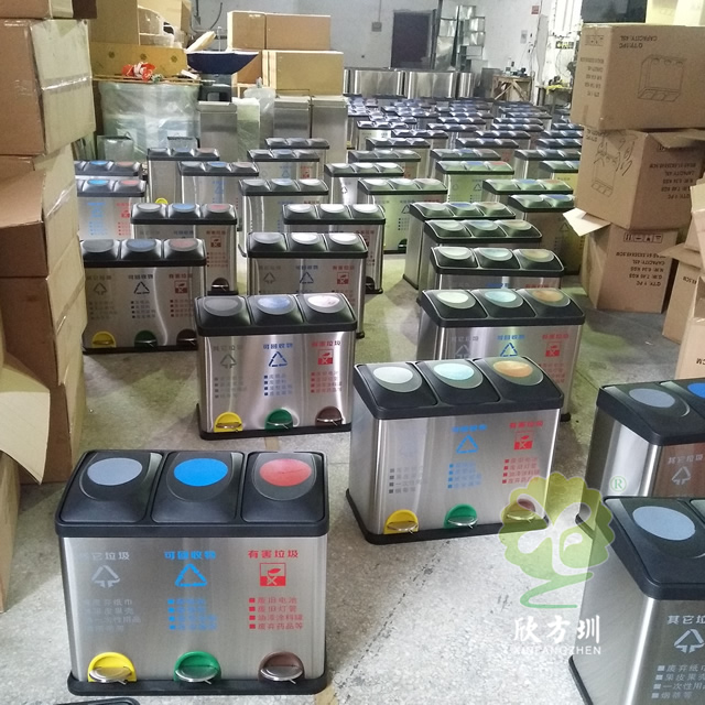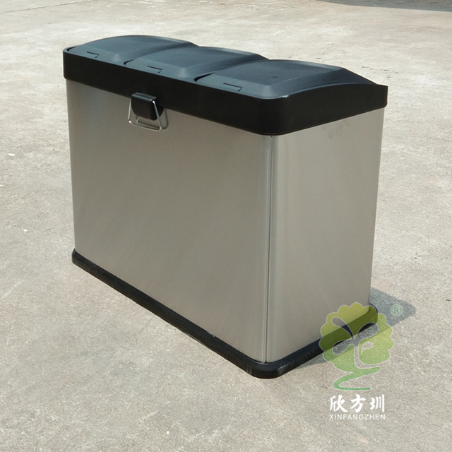室内静音脚踏式三分类不锈钢垃圾箱采用201不锈钢板制作而成,其他垃圾、可回收物、有害垃圾三个分类脚踏式设计,桶身底部黑色部分材质采用了橡胶皮制作搬运挪动的时候不会响声,桶盖采用了塑料制造开盖的时候声音比较小,可以定制丝印其他企业名称、干垃圾、湿垃圾、厨余垃圾电镀。