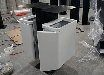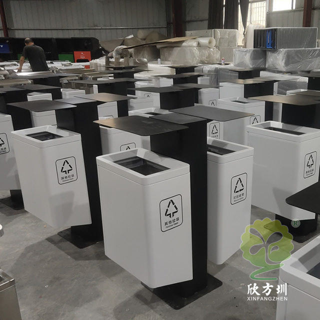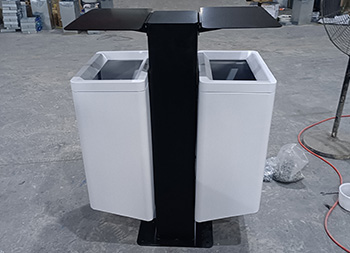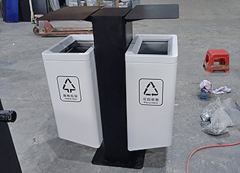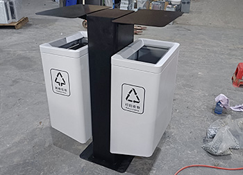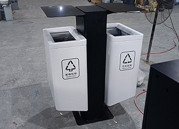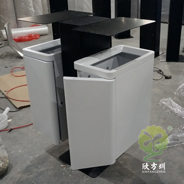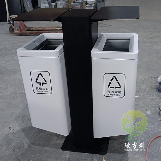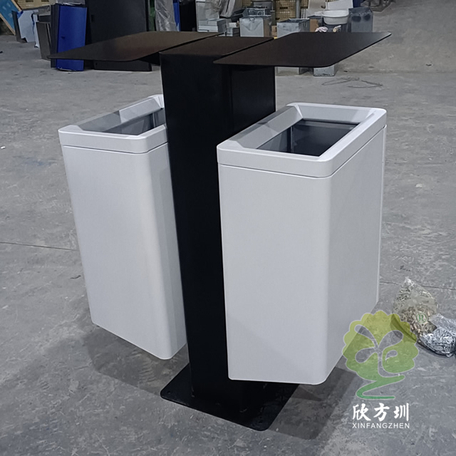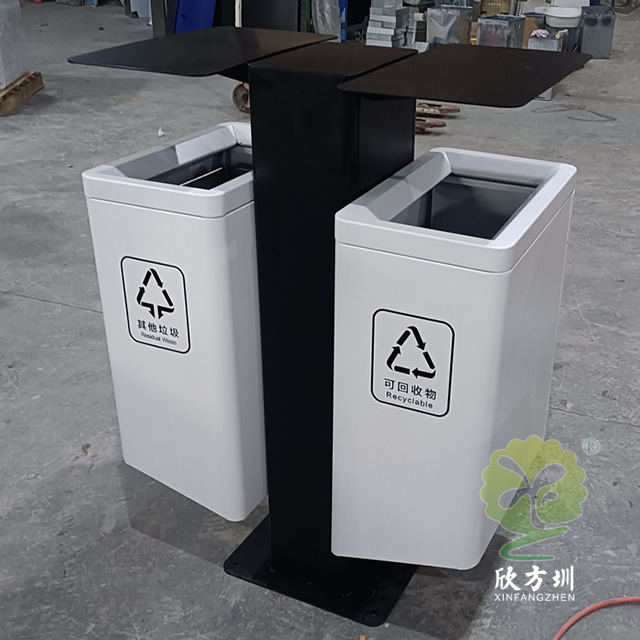 市政道路喷塑不锈钢分类果皮箱桶身采用了1.2mm厚201不锈钢制作而成,盖子不锈钢板3.0mm厚,底座5.0mm厚镀锌板,内胆内筒采用了201不锈钢0.5mm厚,底部4个直径12mm开孔,桶身烤漆白色,柱子烤漆黑色,丝印黑色其他垃圾、可回收物的标识,这款垃圾桶大气用料都是比较足。