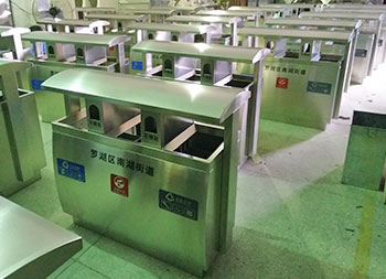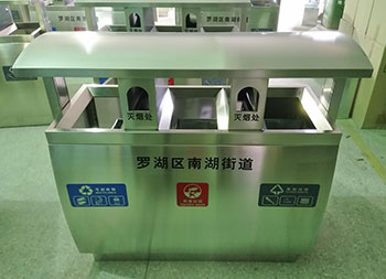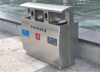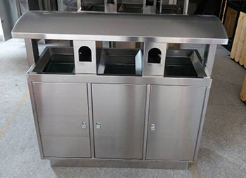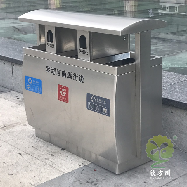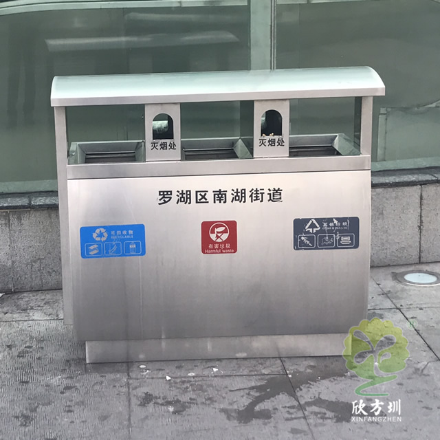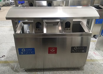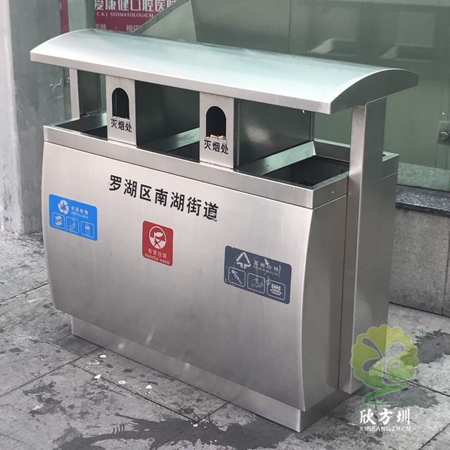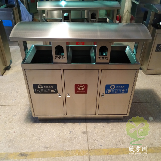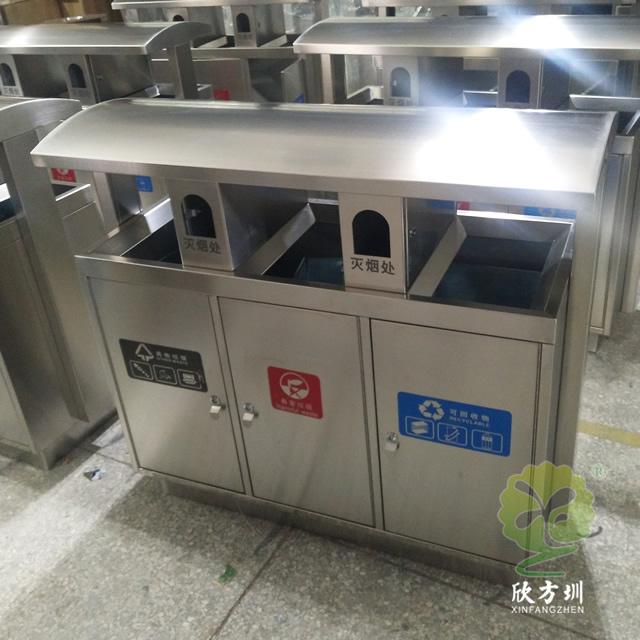 市政街道三分类不锈钢垃圾箱使用了优质的304#不锈钢板制造而成,其他垃圾、有害垃圾、可回收物三分类顶部正面弧形设计,桶身整体哑光投口镜面不锈钢工艺,双面垃圾烟灰两个烟灰盅投口,可以定制此款两分类、四分类、五分类。