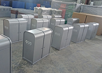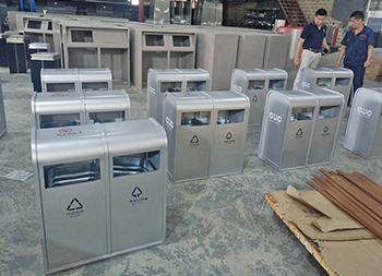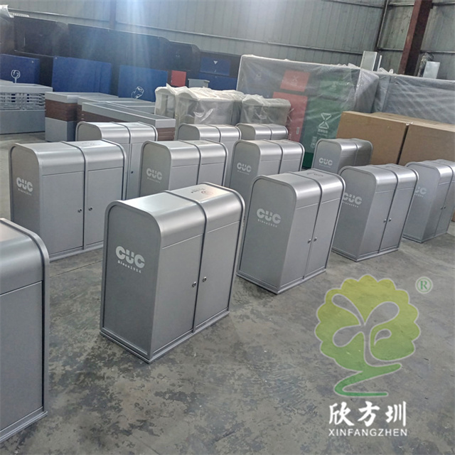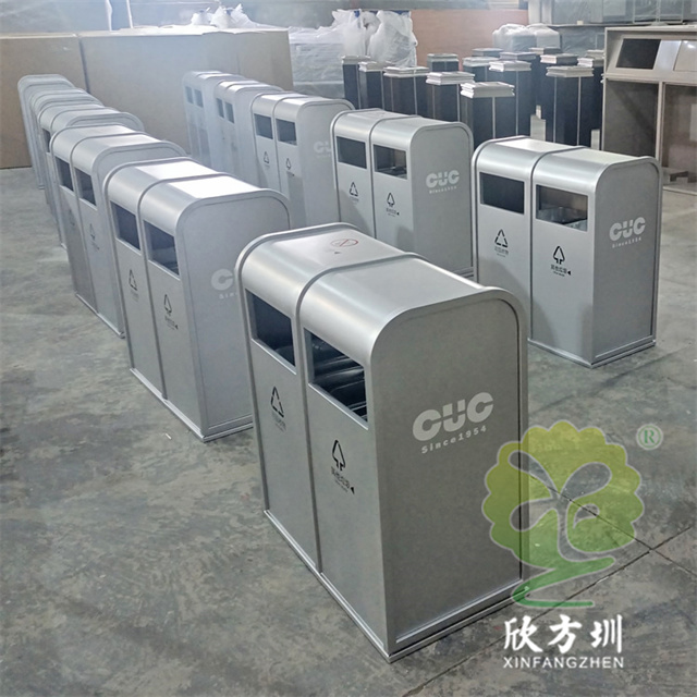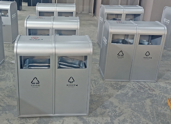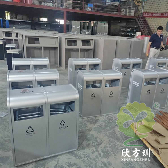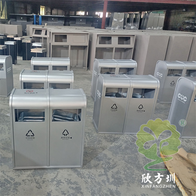 户外喷塑双开门两连体不锈钢分类垃圾桶制作精良,喷塑方形连体两分类垃圾桶设计,适合摆放在室内物业小区、市政街道、城市广场、公园景区等等,注重产品细节部位处理坚固耐用,安全无利口,不伤手,框架201不锈钢外筒,镀锌板内筒也可以选择塑料、不锈钢、玻璃钢等等,便于垃圾清倒。