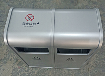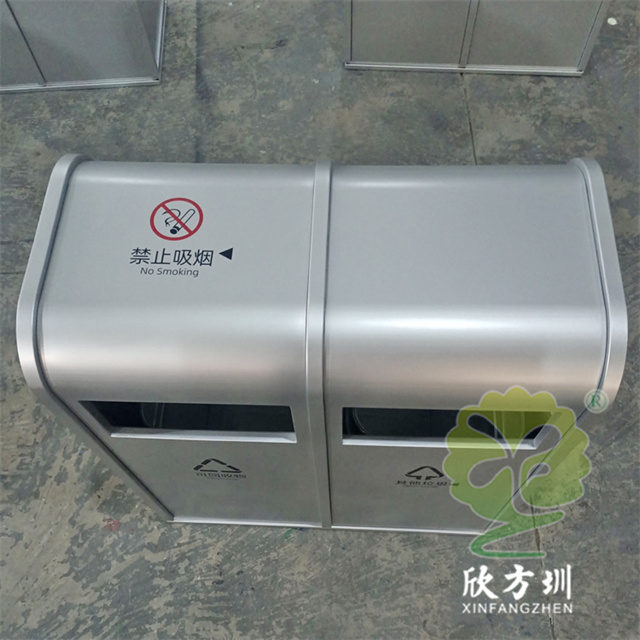 户外喷塑双开门两连体不锈钢分类垃圾桶采用1.2mm厚201不锈钢板制作而成,户外两连体双分类方形设计,桶身金属表面喷粉银色,油墨丝网印刷最新国标分类标识及企业logo,可以定制材质厚度以及银色或者规格,果皮箱无烟灰盅。
