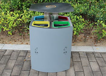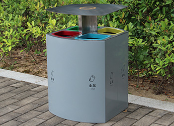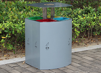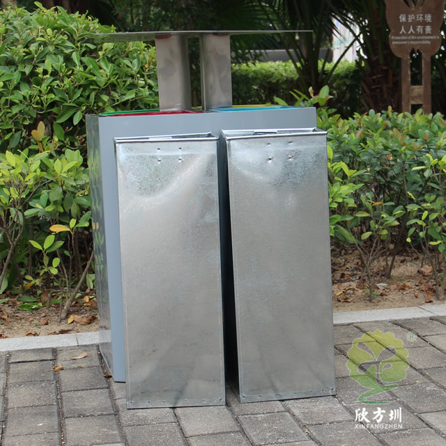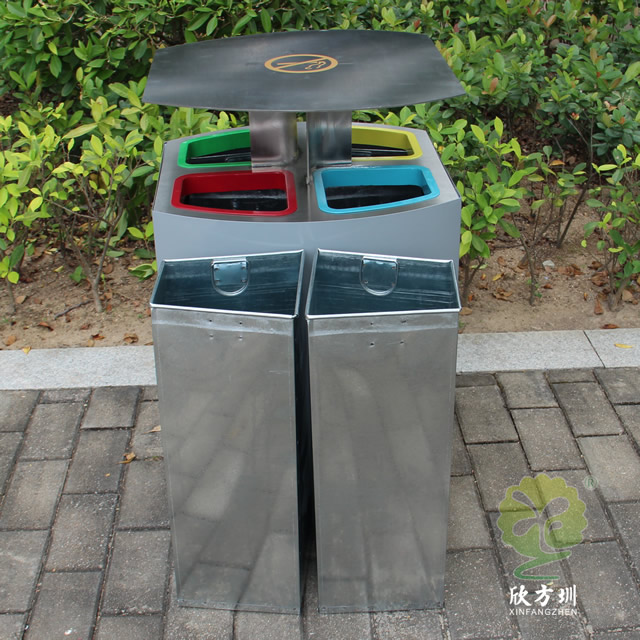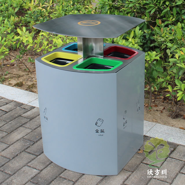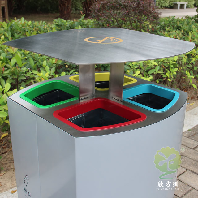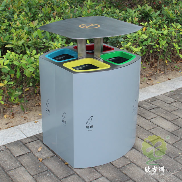 喷塑不锈钢四分类垃圾桶制作精良,户外四分类资源回收箱设计,适合摆放在物业小区、市政街道、旅游景区等等,注重产品细节部位处理坚固耐用,安全无利口,不伤手,201不锈钢外筒,镀锌板内筒 ,便于垃圾清倒。