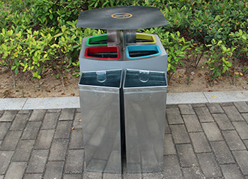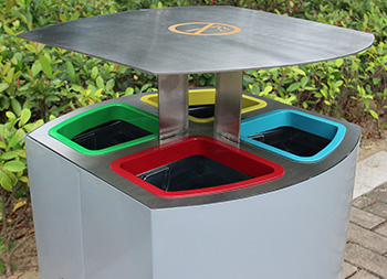 喷塑不锈钢四分类垃圾桶这款果皮箱采用201不锈钢板制作而成,正方形前后坡面设计,桶身采用了高温灰色烤漆,桶盖顶部不锈钢本色,投口边缘红黄蓝绿四色烤漆是一款资源回收箱,丝网印刷了玻璃金属纸类塑料文字和图标,桶盖顶部丝印了禁烟标识,桶盖直接往上提可以直接取出内筒。