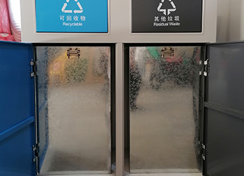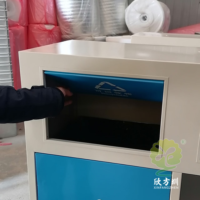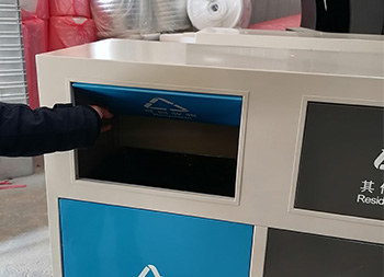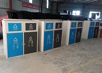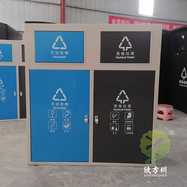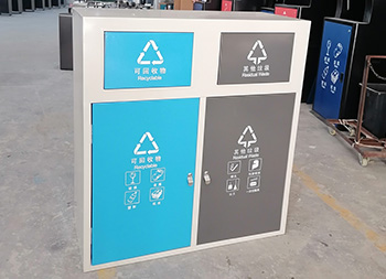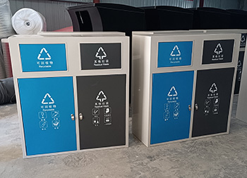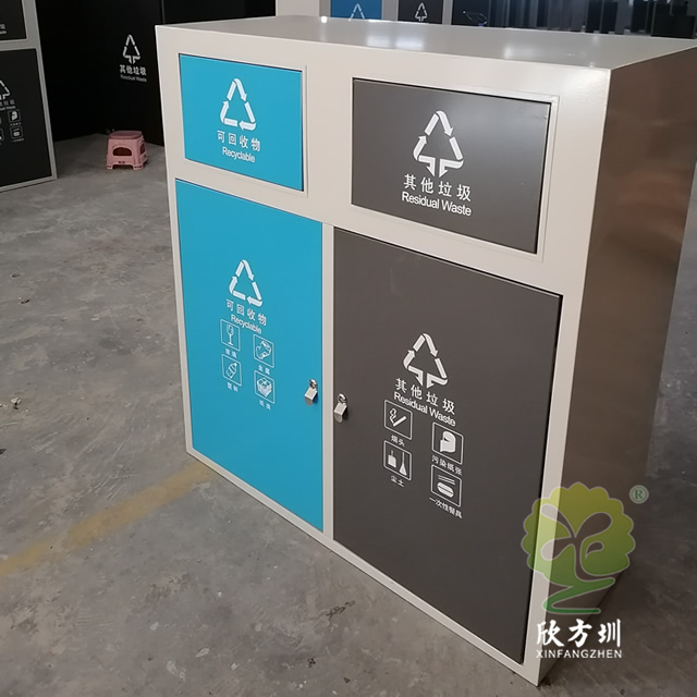户外方形不锈钢连体分类垃圾箱采用了201不锈钢1.0厚的板制作而成,这款垃圾桶高档简洁带摇摆盖方形两分类设计,垃圾箱桶身框架表面米白色喷涂喷塑的,可回收物的门板和桶盖喷塑了蓝色,其他垃圾门板和桶盖喷塑了黑色,桶盖和门板油墨丝网印刷了白色的可回收物和其他垃圾分类标识,这样的喷塑能够良好的区分垃圾桶的分类。