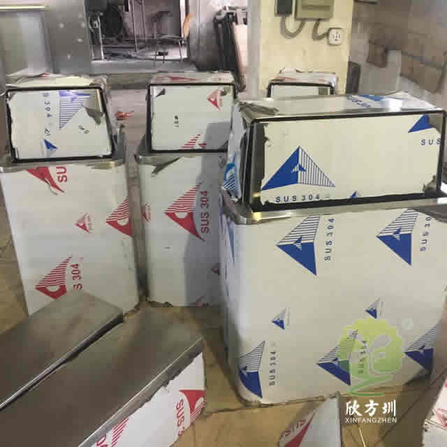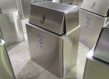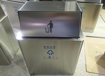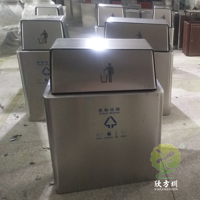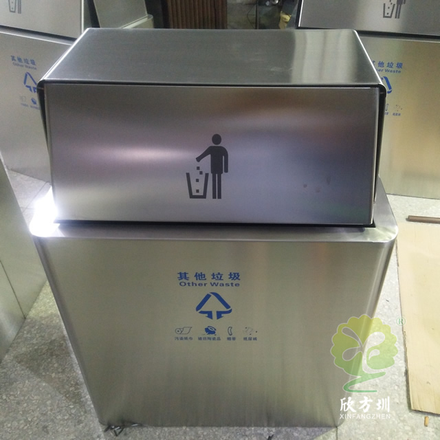 304推拉盖方形不锈钢垃圾桶这款其他垃圾果皮箱采用了耐腐蚀加厚的304不锈钢板制造而成,桶身方形设计桶盖推盖式设计,桶身整体为金属本色,桶盖前后丝网印刷了黑色的人头标,桶身丝印了蓝色的其他垃圾分类标识,我们欣方圳生产厂家支持来图来样定制,烤漆、喷塑、电镀、UV打印、防指纹处理、镂空等工艺定制。