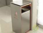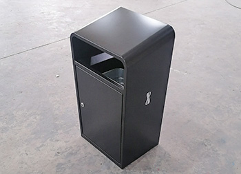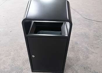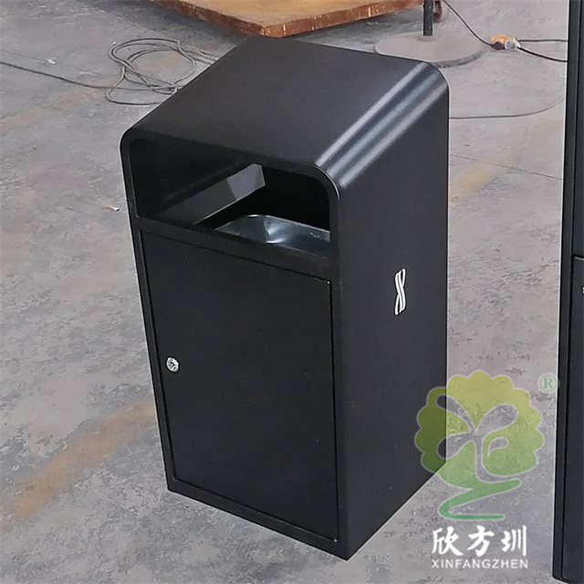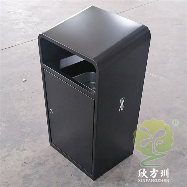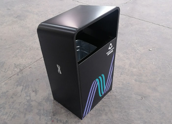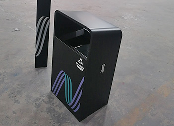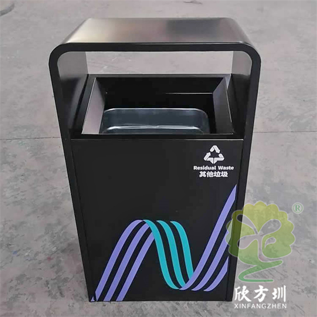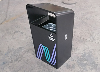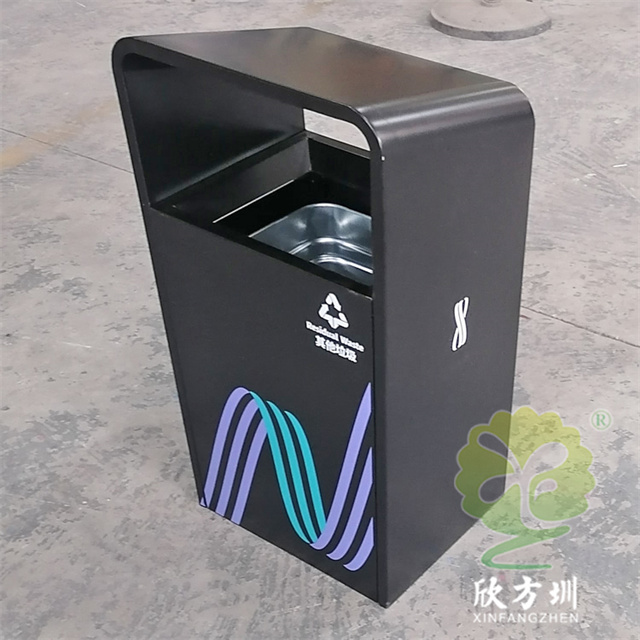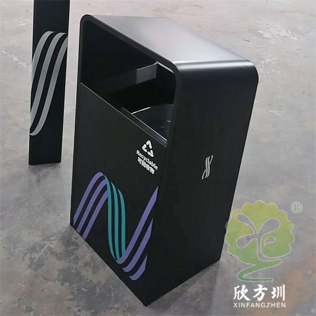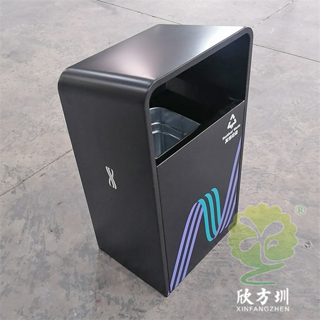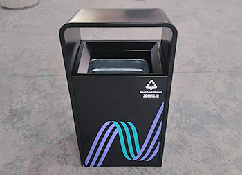 户外UV打印加厚喷塑不锈钢垃圾桶单筒这款外筒201不锈钢 1.5mm 厚度生产,桶身整体黑色喷塑烤漆,丝印企业logo和分类标识,UV打印彩色图案,方形单筒顶部坡面前高后低设计,背面可以使用三角钥匙取出内置的内筒,可以根据客户要求定做。
